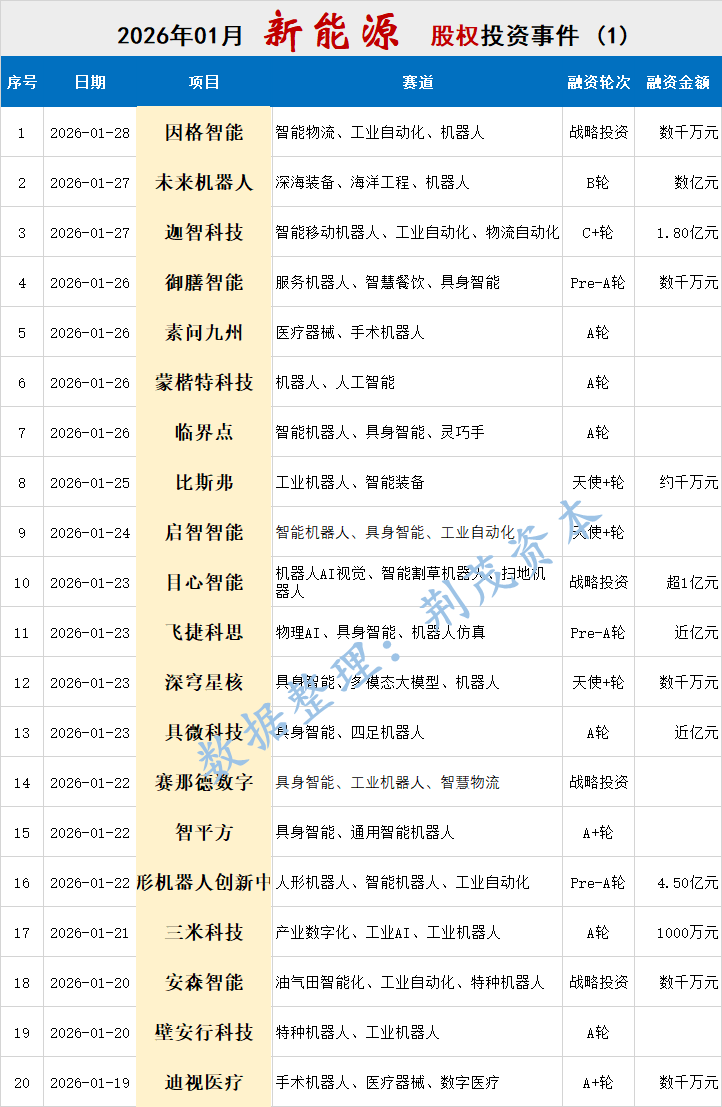 2026 年的第一个月,机器人赛道并未因年关而降温,反而迎来一轮密集的资本注入。一个月内,63 起公开融资事件,已披露总金额近百亿元,一场围绕智能机器人的技术角逐与产业卡位战已悄然打响。