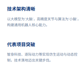 这类项目的共同特点是:以大模型为“大脑”,以高精度关节和运动控制算法为“小脑”,旨在打造能适应开放环境的通用机器人。由于其技术壁垒高、想象空间大,吸引了红杉、高瓴、深创投等一线机构持续押注。