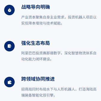 产业资本(如阿里、招商局、中石化)的投资则带有强烈的战略协同色彩。 阿里巴巴通过旗下基金投资智慧物流机器人 赛那德数字,强化其物流体系的自动化能力。招商局集团同时投资了水下机器人公司 OceanX 和人形机器人公司 逐际动力,布局海陆高端装备。