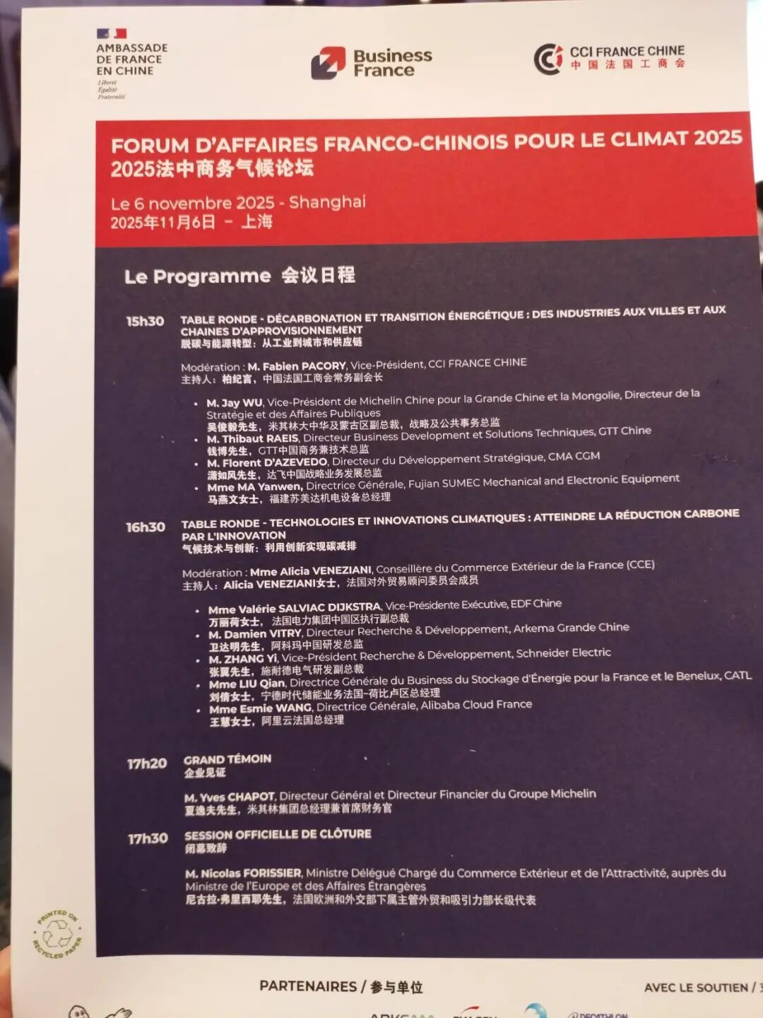 2025年11月6日,法中商务气候论坛在上海隆重举办。据了解:本次论坛聚焦全球气候行动背景下的中法绿色合作新机遇,汇聚两国政府代表、行业领军企业、学术专家及主流媒体,共同探索绿色发展路径。米其林集团总经理兼首席财务官夏逸夫(Yves Chapot)、米其林大中华及蒙古区总裁兼首席执行官叶菲,以及米其林大中华及蒙古区副总裁、战略及公共事务总监吴俊毅受邀出席论坛,围绕减碳与脱碳关键议题展开深入探讨。泷澹实业(上海)有限公司、泷澹工业互联网平台、泷澹未来工业网、泷澹未来制造网、泷澹新能源网、泷澹环保产业网、泷澹新材料产业网、泷澹新能源汽车产业网等领导与专家非常荣幸再次现场参与本次活动。据了解:今年正值《巴黎协定》达成十周年,可持续发展已成为全球共识。本届论坛围绕“脱碳与能源转型”“可持续消费与负责任创新”“气候技术与创新”三大主题展开研讨,旨在推动各方在绿色经济、低碳技术和政策实践等领域交流合作,助力全球碳中和目标的实现。论坛作为中法合作旗舰活动,也已列入2025年进博会官方日程。泷澹实业(上海)有限公司的专家表示:绿色发展路径是以效率、和谐、持续为核心的经济社会转型方式,通过创新驱动、产业升级、政策协同和国际合作实现生态保护与经济增长的平衡,涵盖理论框架、区域实践、政策工具及全球协作等多维度探索。泷澹工业互联网平台的领导则表示:绿色发展路径强调将环境资源作为发展内在要素,以绿色低碳循环为原则,通过“绿色化”经济活动实现经济、社会和环境可持续性。其理论基础包括可持续发展理论、生态文明建设及“两山论”,目标是在资源环境约束下构建新型发展模式。