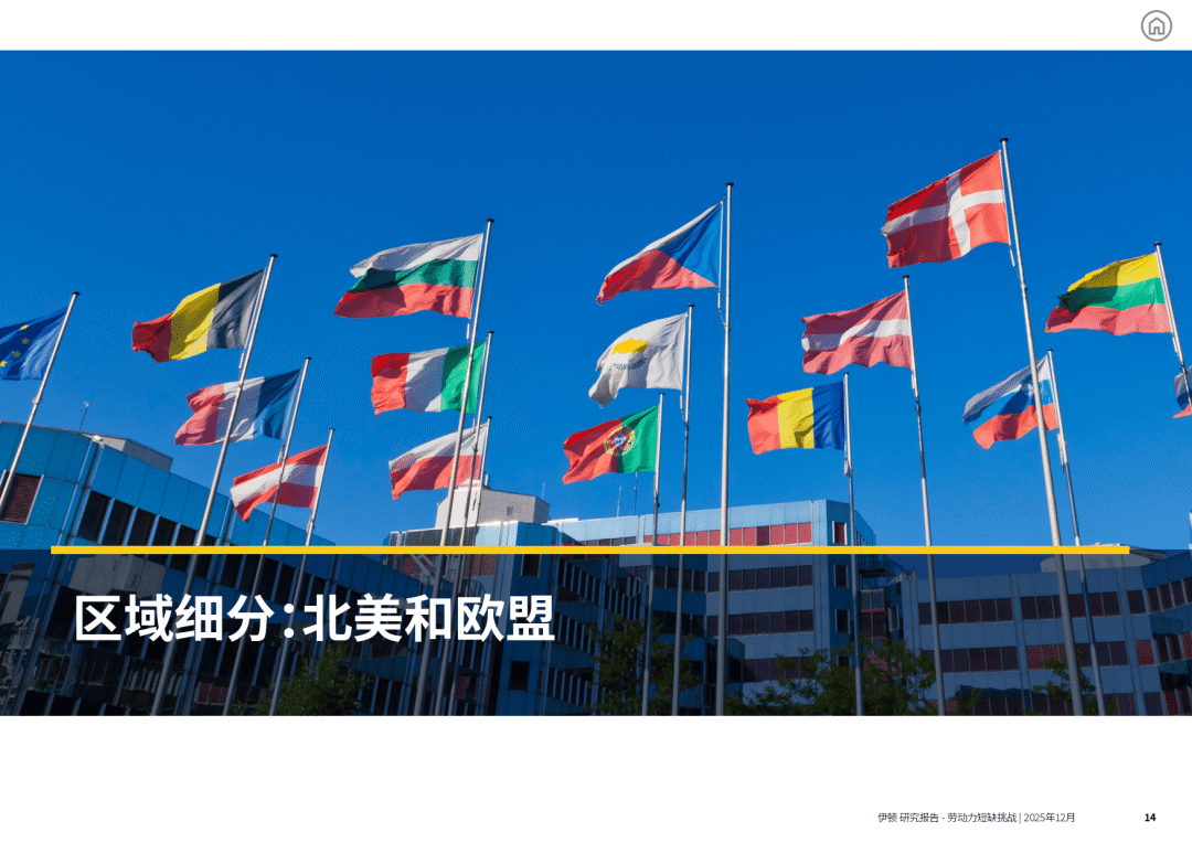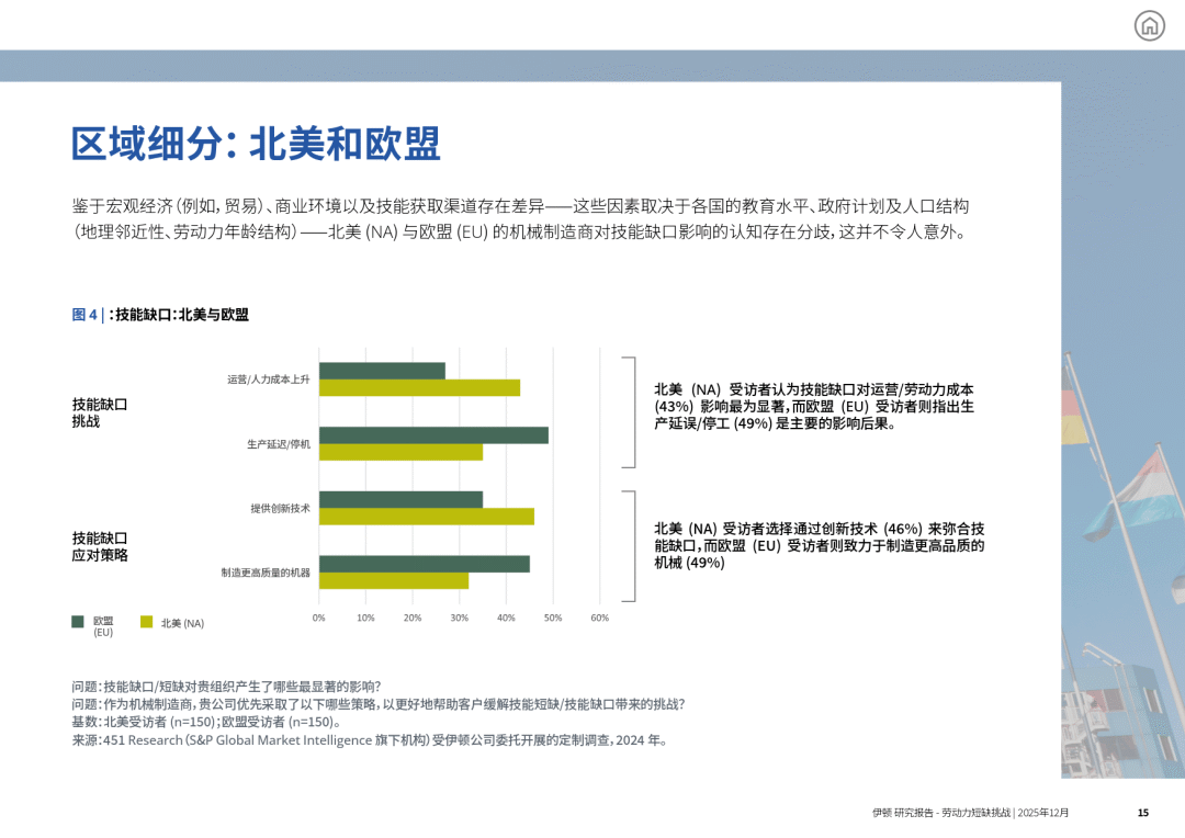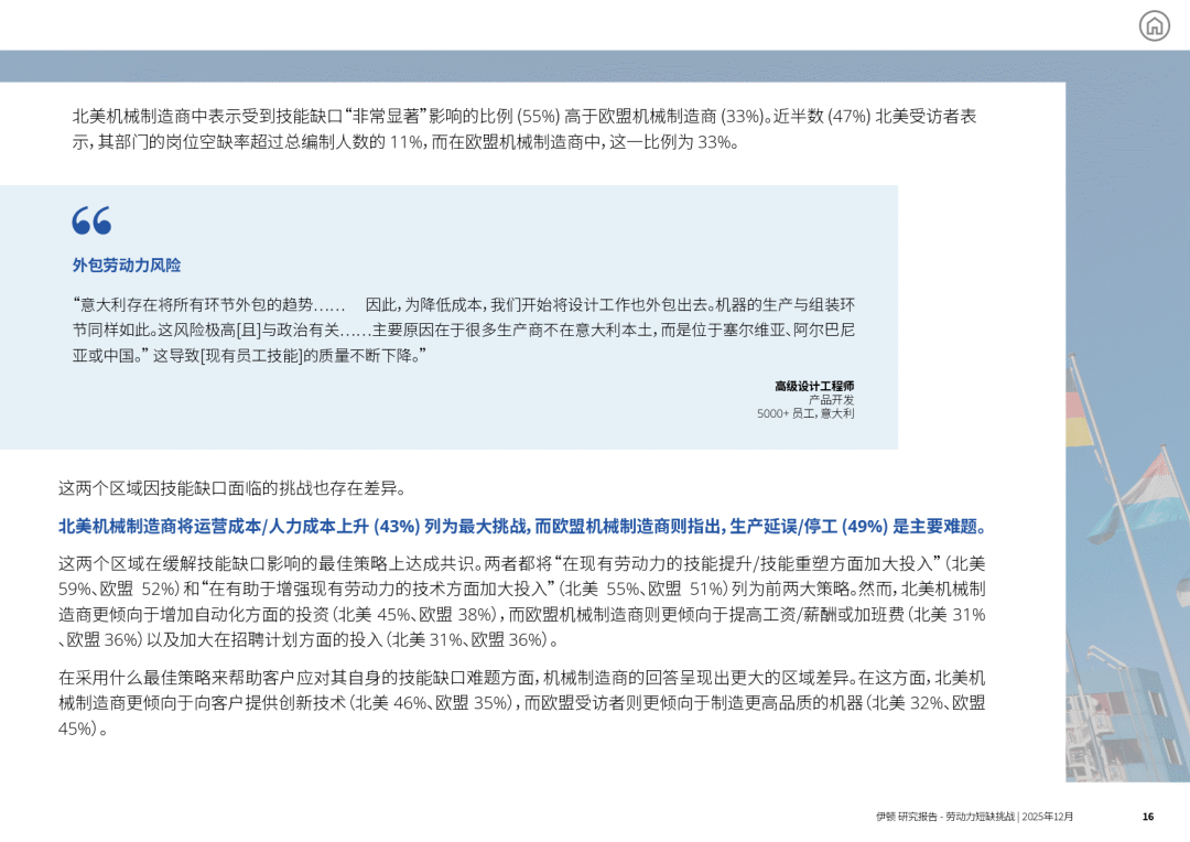 区域差异显著,北美受技能缺口 “非常显著” 影响的比例(55%)高于欧盟(33%),且北美企业岗位空缺率超 11% 的比例(47%)也高于欧盟(33%)。北美企业最关注运营成本上升(43%),优先通过创新技术应对;欧盟企业则受生产延误 / 停工影响最深(49%),更侧重制造高品质机械。两地共识是加大现有员工技能提升和技术投入,但北美更倾向自动化投资,欧盟更注重薪酬提升与招聘投入。