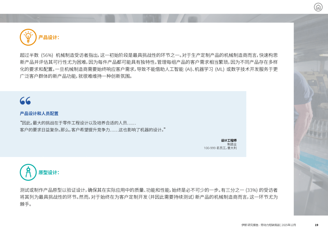 未来趋势上,技能缺口将持续影响行业竞争格局,能够有效应对该挑战的企业将获得长期优势。数字化、自动化与智能化成为破局关键,既有助于弥补人力短缺,也能满足客户对易用性、低运营成本的需求。同时,“产品即服务” 模式虽具增长潜力,但受限于维护人员和数字化技能不足,仍需行业持续突破。报告强调,机械制造商需通过设计易用化、高性能的智能设备,同时完善内部人才培养与技术升级,才能双重解决自身与客户的技能缺口难题。