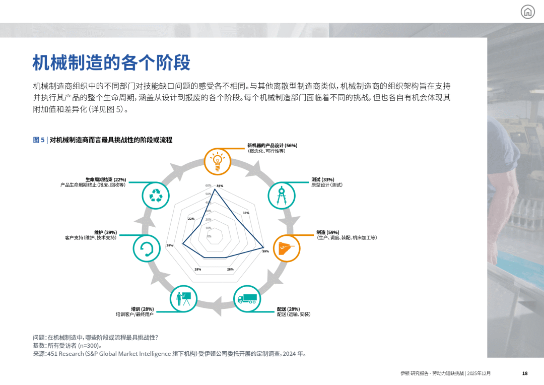 业务影响层面,技能缺口全面冲击企业运营,其中运营成本上升(38%)、产品质量下滑和产量下降是最主要的业务后果,同时还导致培训成本增加、停机时间延长、新产品开发滞后等问题。不同制造阶段受影响程度各异,产品制造(59%)和产品设计(56%)被列为最具挑战性的环节,客户支持(39%)、原型设计(33%)等环节也面临较大压力。生产部门更受人才招聘难题困扰,产品开发部门则面临零部件短缺和数字化技能不足的双重挑战。