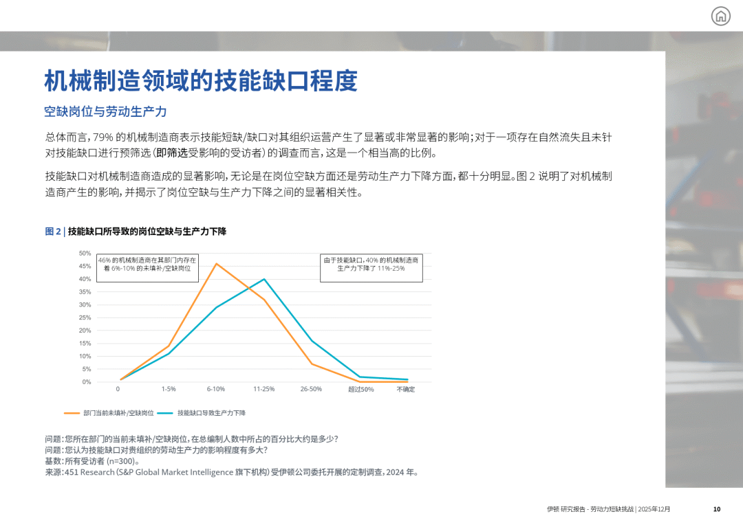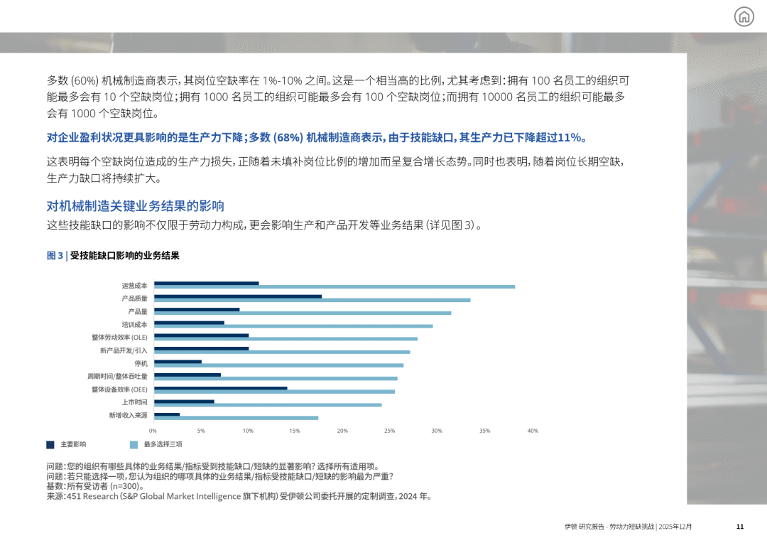 核心现状方面,技能缺口已成为行业首要挑战,79% 的受访机械制造商表示其运营受到 “非常显著” 或 “显著” 影响。三大突出问题分别是招聘和留住年轻人才(49%)、劳动力技能短缺(40%)以及关键技能员工退休流失(39%)。岗位空缺与生产力下降形成恶性循环,60% 的企业岗位空缺率在 1%-10%,68% 的企业因技能缺口导致生产力下降超 11%,且空缺岗位越多,生产力损失呈复合增长态势。