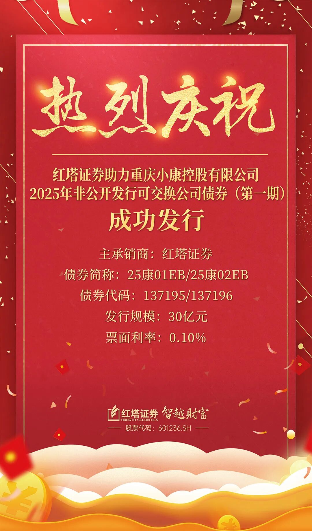 2025年12月5日,由红塔证券担任主承销商的重庆小康控股有限公司2025年面向专业投资者非公开发行可交换公司债券(第一期)在上交所成功发行。红塔证券聚焦国家战略方向,充分发挥聚焦优势,通过与投资者积极沟通,为客户量身定制发行方案,有效引导市场资金支持新能源制造企业发展。本期债券募集资金规模30亿,票面利率0.10%,期限3年。在发行人快速发展及业务转型升级的关键时期,本期债券的成功发行有效助力其降低融资成本。