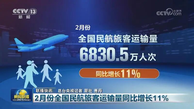 记者从民航局了解到,2月份,全国民航旅客运输量达6830.5万人次,同比增长11%;国内、国际旅客运输量分别同比增长10.5%和15.6%;民航货邮运输量达74万吨,同比增长22.3%。