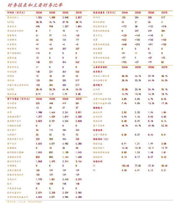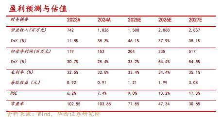 考虑到公司研发投入加大,我们调整2025-2027年公司营收预测为15.00、20.68、28.57亿元(原值为15.00、19.74、26.02亿元),分别同比+46.1%、+37.9%、+38.1%;归母净利润预测为2.04、3.35、5.17亿元(原值为2.66、3.80、5.21亿元),分别同比+33.2%、+64.4%、+54.5%;对应EPS为1.21、1.99、3.08元(原值为1.58、2.26、3.10元)。2025/10/29日股价94.35元对应PE分别为77.85、47.34、30.65倍,维持“增持”评级。