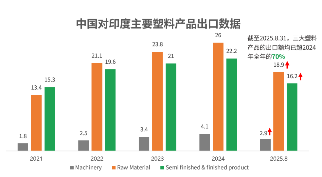 从塑料行业来看,根据中国海关数据统计,截至2025年8月31日,中国出口到印度的塑机、原材料、制品&半制品的出口额均已超过2024年全年的70%。