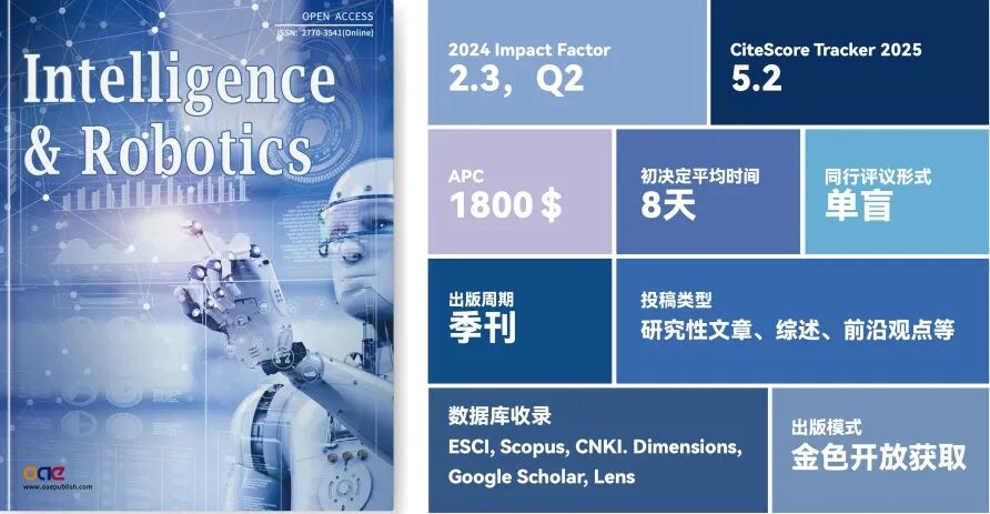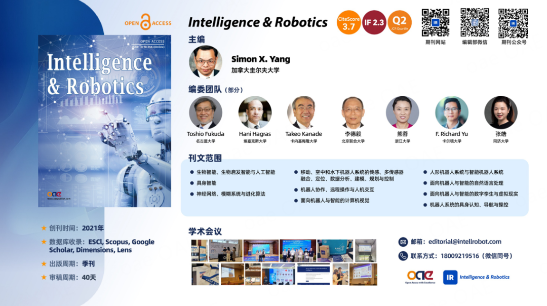 Intelligence & Robotics(IR, Online ISSN 2770-3541)是OAE Publishing Inc.于2021年6月创办的一本金色开放获取、严格同行评议的国际学术期刊,ESCI (IF=2.3, Q2)、Scopus (CiteScoreTracker=4.1)、Dimensions、Lens收录。由加拿大工程院院士、圭尔夫大学终身教授Simon. X. Yang担任主编,美国工程院院士Takeo Kanade、中国工程院院士柴天佑、中国工程院院士李德毅、日本工程院院士Toshio Fukuda、加拿大皇家学院院士Clarence W. de Silva、欧洲科学院外籍院士焦李成担任顾问编委。