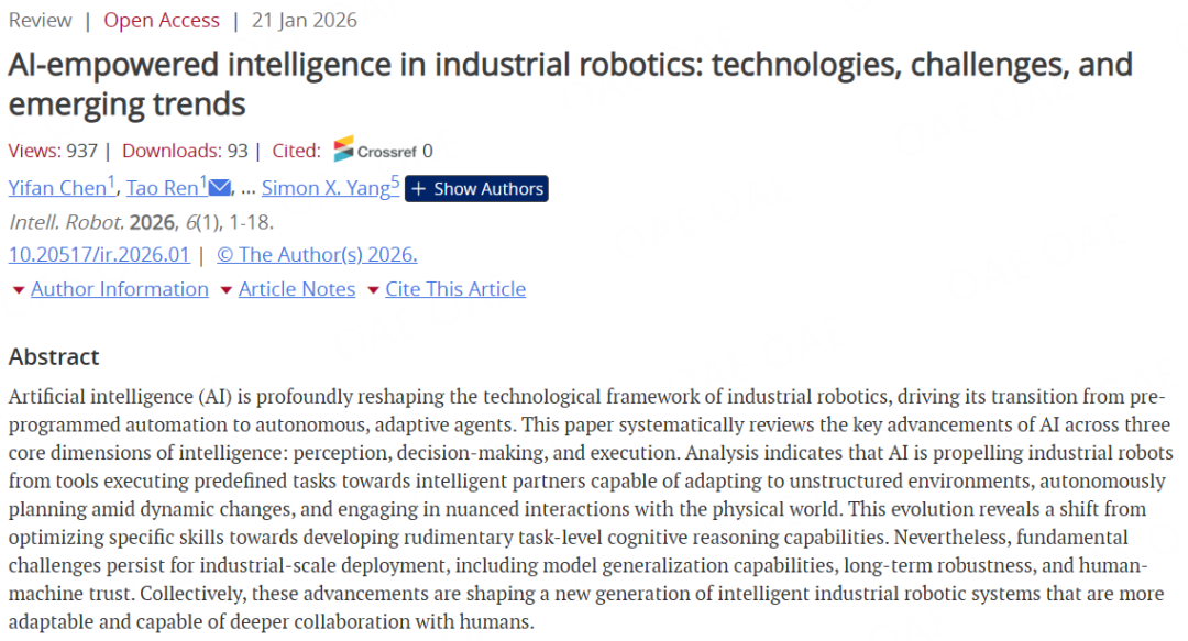 工业机器人正经历一场深刻的技术变革:从传统的高精度重复任务执行工具,向具备自主感知、智能决策和灵活执行能力的智能伙伴转型。《AI-empowered intelligence in industrial robotics》这篇文章系统综述了人工智能在工业机器人中的最新应用、面临的挑战以及未来趋势,为工业智能化提供了全景式视角。
