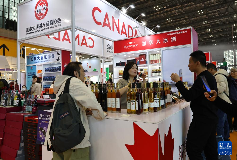 12月19日,参观者在加拿大商品展台前与工作人员交流。图源:新华社
