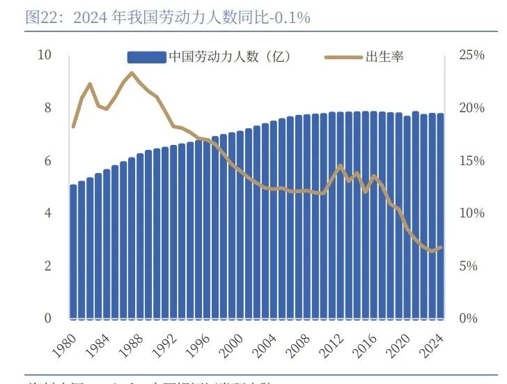 中国市场劳 动力人口 增长放 缓、出生率 下滑叠加 人口老 龄化深化, 劳动力边 际递减 趋势带来机 器人需求提升。据世界银行数据,2024 年我国劳动力人数为 7.7 亿人,同比-0.1%,20 世纪以来我 国劳动力人口增长呈现明显放缓趋势。据国家统计局数据,2024 年我国人口出生率为 6.8%,60 岁 及以上人口占比为 22.0%,同比+0.9pct,65 岁及以上人口占比为 15.6%,同比+0.2pct,2020 以 来我国人口出生率中枢降低至 10%以下,持续走低,我国人口老龄化趋势进一步深化,我国劳动力 人数面临边际抵减趋势,带来劳动力市场对以机器人为代表的自动化设备的需求提升,以弥补劳动 力人口的缺失。