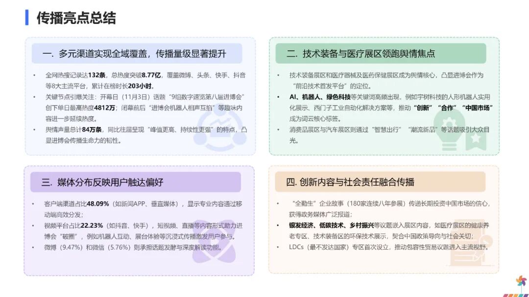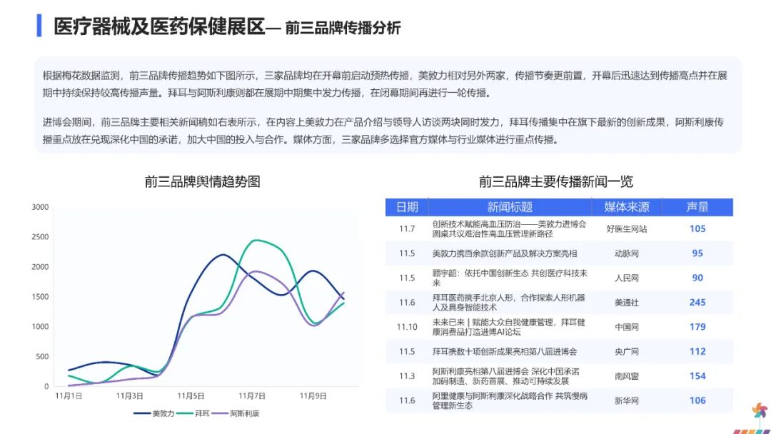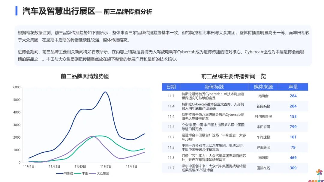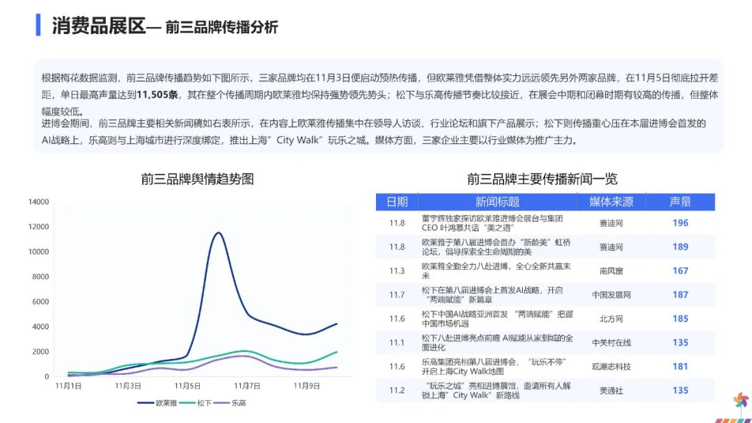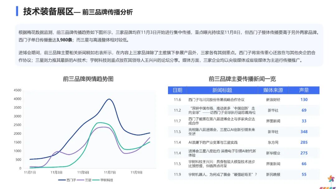 这一传播走势表明,公众对进博会的关注主要集中在开幕与闭幕两个关键节点,展会中期的舆论焦点则更多转向各参展品牌发布的新技术与新产品,对进博会本身的整体关注相对趋于平缓。