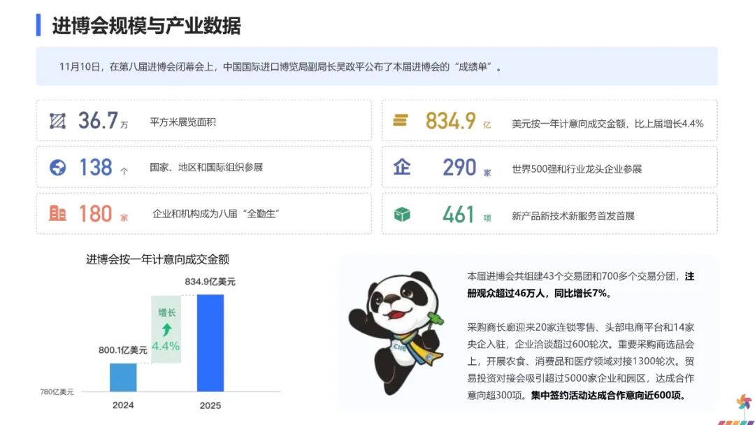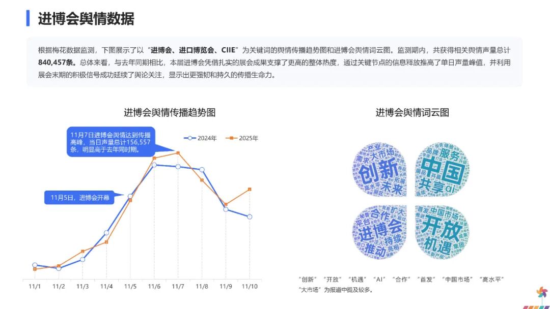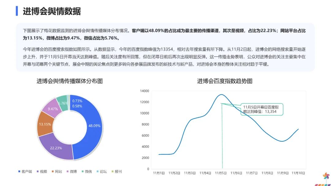 从数据显示,今年的百度指数峰值为13354,相对去年搜索量有所下降。从11月2日起,进博会的网络搜索量开始逐步上升,并于11月5日开幕当天达到峰值。随后关注度有所回落,但在闭幕日前后再次出现明显反弹。