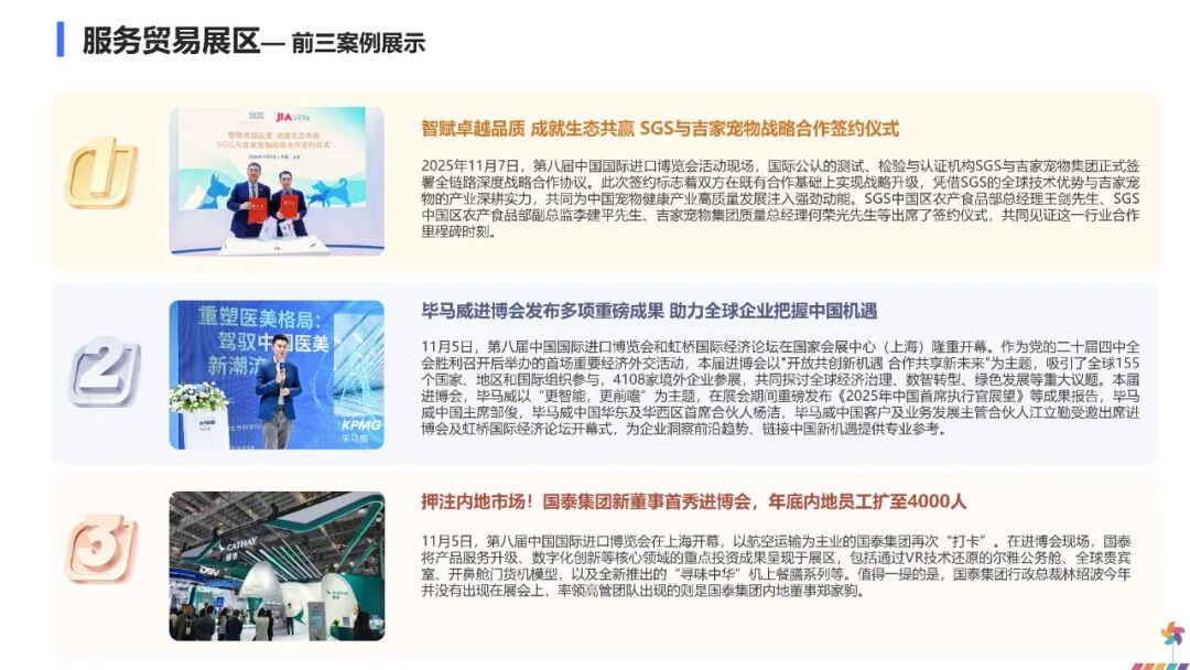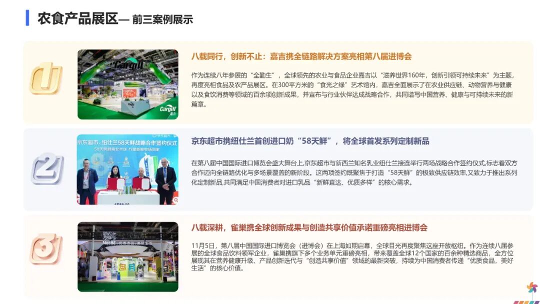 采购商长廊迎来20家连锁零售、头部电商平台和14家央企入驻,企业洽谈超过600轮次。重要采购商选品会上,开展农食、消费品和医疗领域对接1300轮次。贸易投资对接会吸引超过5000家企业和园区,达成合作意向超300项。集中签约活动达成合作意向近600项。