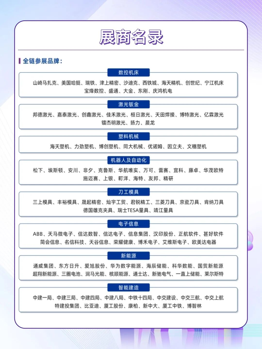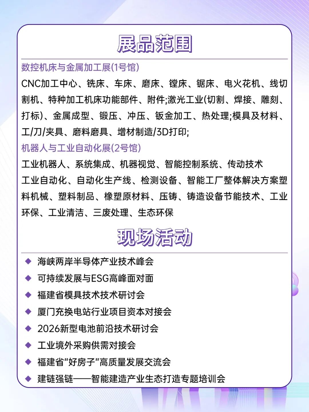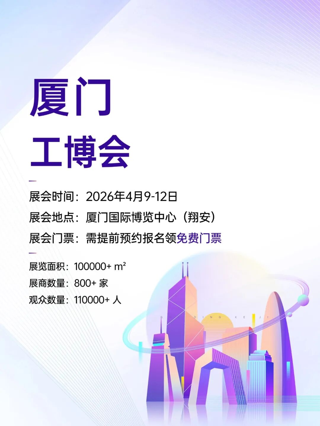 2026厦门工业博览会将于4月9-12日(09:00-17:00)在厦门国际博览中心(翔安)举办。聚焦智能制造、工业互联网、新能源等战略性新兴工业领域,汇聚全球工业力量,通过展览展示、会议活动、供需对接等多元形式,全新打造数智化全链生态展示平台,深度贯通“研造用创”,驱动制造业数字化转型升级和高质量发展。