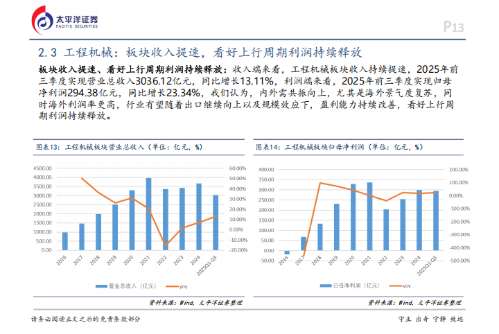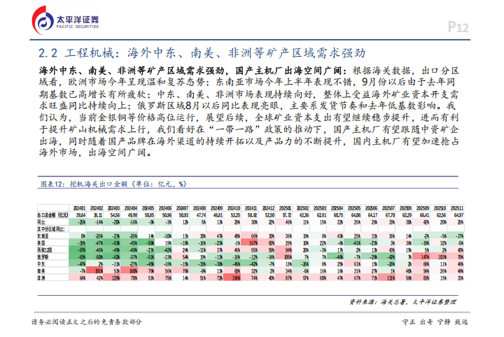 具体看区域表现,中东、南美、非洲等矿产区域的需求异常强劲,主要因为金、银、铜等金属价格高位运行,刺激了全球矿业的资本支出,这为国产主机厂提供了广阔的海外空间。从企业经营角度看,海外市场的利润率普遍高于国内,随着出口占比提升和规模效应显现,工程机械板块在2025年前三季度的营业总收入和归母净利润分别增长了13.11%和23.34%,行业正处于上行周期的利润释放阶段。