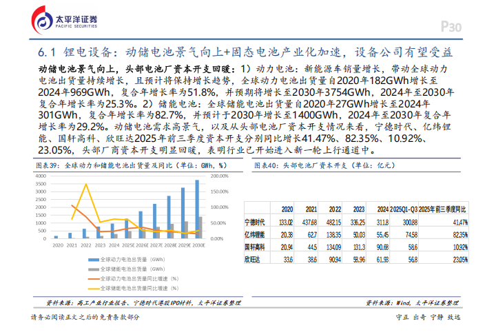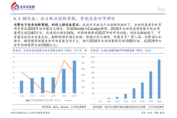 专用设备领域,锂电设备正跟随头部电池厂的资本开支回暖进入新周期。宁德时代、亿纬锂能、国轩高科、欣旺达在2025年前三季度的资本开支分别增长了41.47%、82.35%、10.92%和23.05%。固态电池的产业化也在提速,宁德时代计划2027年小批量生产,而亿纬锂能的量产基地一期已经建成。光伏设备端,n型电池片已经成为绝对主流,TOPCon占比达到71.1%。3C设备方面,折叠屏手机有望在2026年迎来爆发,出货量预计增长54%达到2340万台,AI眼镜等可穿戴设备也极具增长空间。