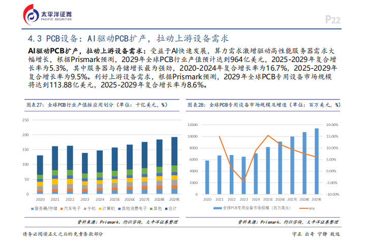 散热领域,传统的风冷技术在面对高功耗芯片时已经显得力不从心。英伟达GB300的功耗预计高达1400W,液冷技术凭借高传热效率和低能耗优势,正成为散热的技术革新方向。按照政策要求,到2025年底,全国大型数据中心的PUE要降至1.25以内,液冷是实现这一目标的必然选择。PCB设备也同时迎来了新机遇,高性能服务器对高层数、高密度板的需求增加,预计2025-2029年全球PCB专用设备市场的复合增长率将达到8.6%。