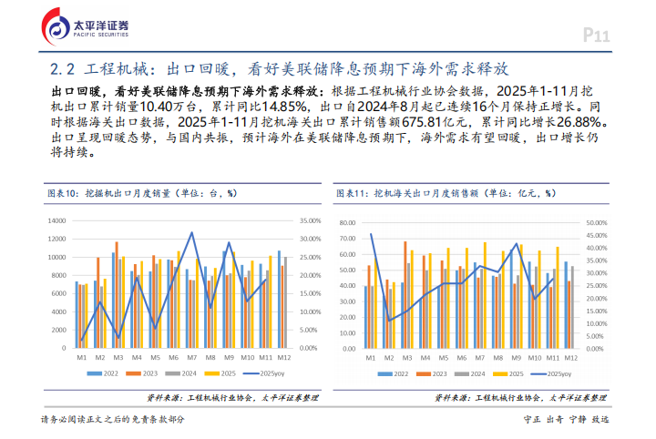 出口端则是另一个强力支撑。自2024年8月起,挖掘机出口已经连续16个月保持正增长,2025年前11个月的出口销量达10.40万台,同比增长14.85%,海关出口累计金额更是达到了675.81亿元,同比增幅26.88%。