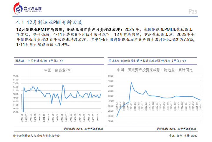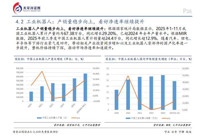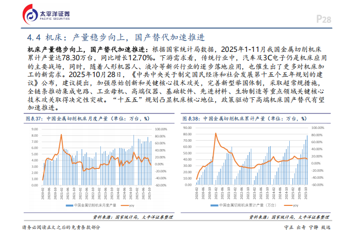 通用设备方面,内需正在筑底反弹。2025年12月制造业PMI重新回到荣枯线上方,显示出回暖迹象。工业机器人表现亮眼,1-11月累计产量达67.38万台,同比增长29.20%,已经超出了2024年全年的水平。叉车行业同样内外开花,国内销量在1-11月达到84.30万台,同比增长14.27%,出口凭借高性价比优势也增长了13.96%。机床行业则受益于“十五五”规划对工业母机核心地位的强调,高端机床的国产替代正在加速,1-11月金属切削机床产量增长了12.70%。