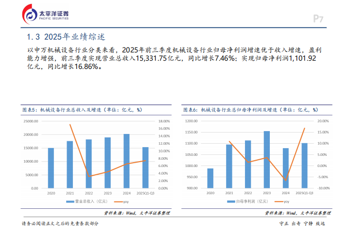 这种超预期的市场表现并非无源之水,从报表端来看,2025年前三季度机械设备行业实现营业总收入15331.75亿元,同比增长7.46%,而归母净利润更是达到了1101.92亿元,同比增长16.86%,利润增速明显高于收入增速,说明整个行业的盈利能力正在变强。