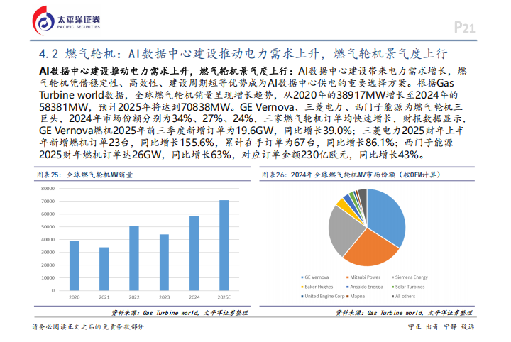 AI算力的狂飙直接拉动了电力和散热相关设备的市场温度。由于AI数据中心对电力稳定性要求极高,建设周期短、效率高的燃气轮机成了供电的首选。全球燃气轮机销量预计在2025年达到70838MW,GE Vernova、三菱电力和西门子能源这三巨头占据了绝大部分份额,其订单量都在快速增长。以西门子能源为例,其2025财年的燃机订单达26GW,同比增长63%,在手订单金额高达230亿欧元。