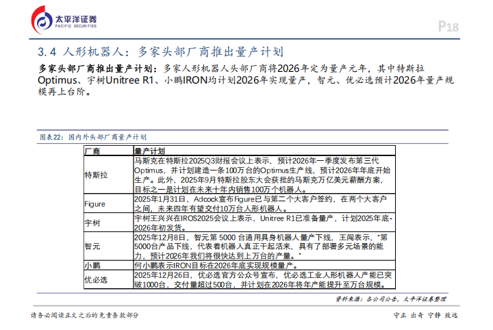 如果说工程机械是老树发新芽,那么人形机器人就是一场硬科技大戏。多家人形机器人头部厂商已经明确将2026年定为量产元年。特斯拉计划在2026年一季度发布第三代Optimus,并在年底前开始运营一条年产100万台的生产线。国内厂商动作同样迅速,宇树科技的Unitree R1已经准备好量产,预计在2026年初发货。智元机器人在2025年末已经实现了第5000台通用具身机器人的量产下线,并计划2026年产量达到万台规模。此外,小鹏汽车的IRON目标也是在2026年底实现规模量产,而优必选已经将产能突破至1000台,计划2026年提升至万台规模。