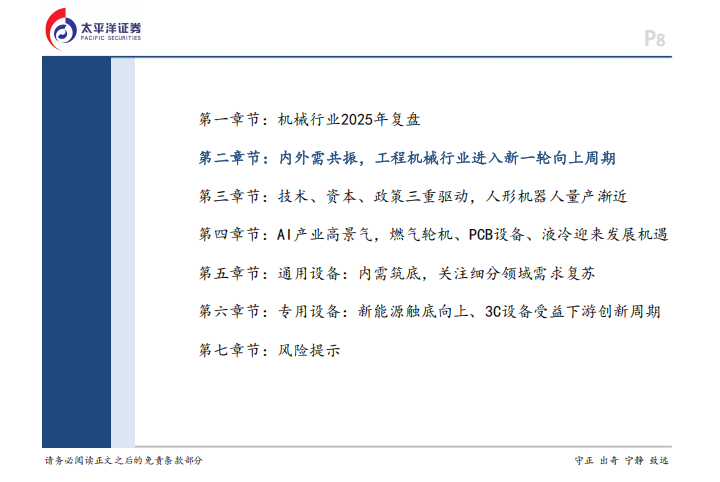 本次梳理基于太平洋证券发布的2026年度的投资策略,围绕工程机械的新一轮向上周期、人形机器人的量产元年、AI产业带动的硬件机遇以及通用与专用设备的复苏方向展开。详细统计了各细分领域的最新产销数据,列举了包括特斯拉、宇树科技、宁德时代在内的多家核心公司动向,为2026年的布局提供参考。