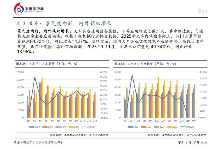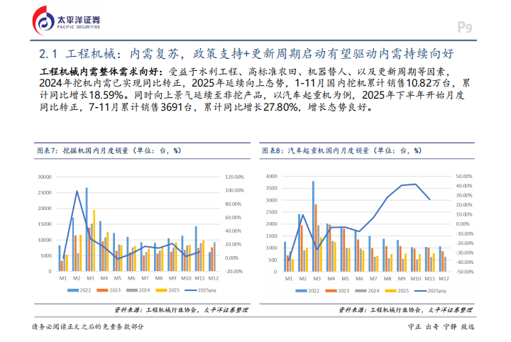 工程机械板块在2025年的表现尤为突出,其中工程机械器件子板块全年上涨93.20%,位居机械子行业涨幅榜首。这种热度源于市场需求的暖,从国内销量来看,受益于水利工程、高标准农田建设以及机器替人等因素,挖机内需在2024年转正后,2025年继续保持向上势头,1-11月国内挖机累计销售10.82万台,同比增长18.59%。除了挖机,汽车起重机也从2025年下半年开始实现月度同比转正,7-11月累计销量达3691台,同比增幅高达27.80%,增长态势非常稳健。