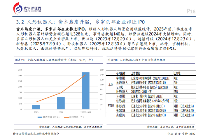 资本市场对这一领域的关注度也在急剧升温。2025年前三季度,全球人形机器人领域的融资金额超过328亿元,融资事件超过140起,热度远超2024年。多家企业正密集推进IPO,优必选、越疆科技、极智嘉、卧安机器人等已经成功在港股上市,宇树科技、乐聚机器人、云深处等厂商也已启动或完成IPO辅导备案。