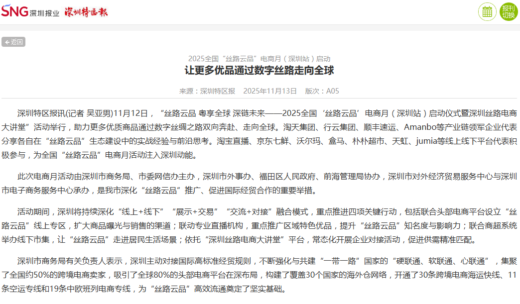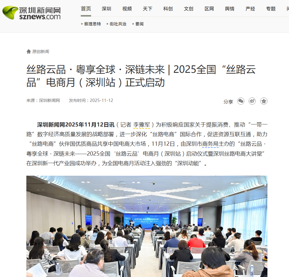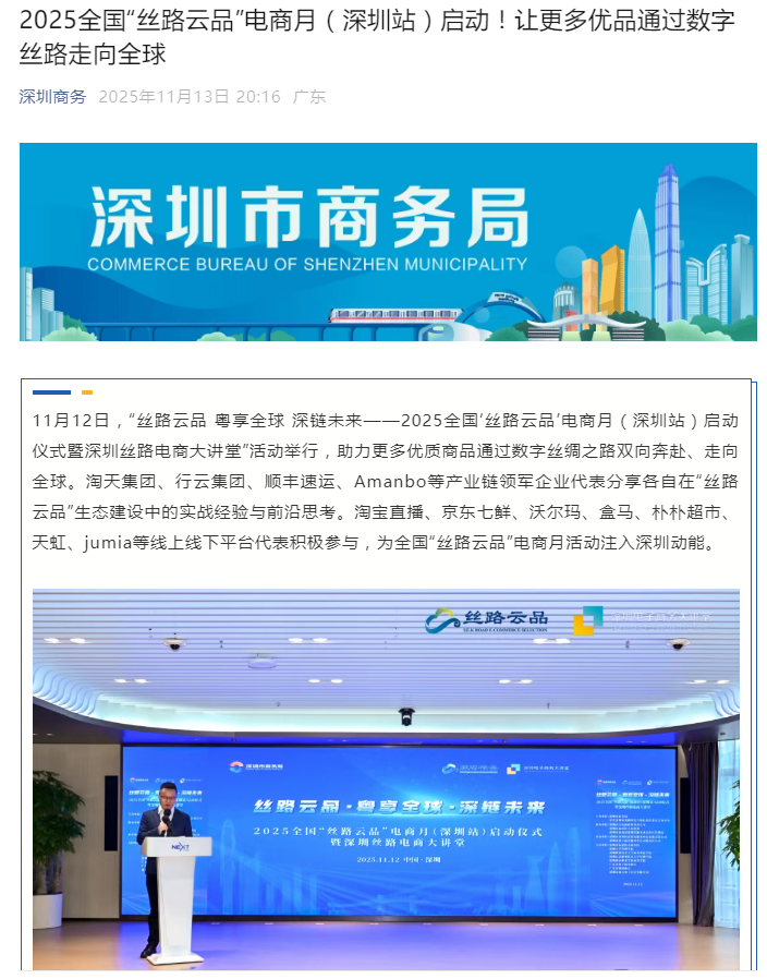 11月12日,“丝路云品 粤享全球 深链未来——2025全国‘丝路云品’电商月(深圳站)启动仪式暨深圳丝路电商大讲堂”活动举行,助力更多优质商品通过数字丝绸之路双向奔赴、走向全球。淘天集团、行云集团、顺丰速运、Amanbo等产业链领军企业代表分享各自在“丝路云品”生态建设中的实战经验与前沿思考。淘宝直播、京东七鲜、沃尔玛、盒马、朴朴超市、天虹、jumia等线上线下平台代表积极参与,为全国“丝路云品”电商月活动注入深圳动能。