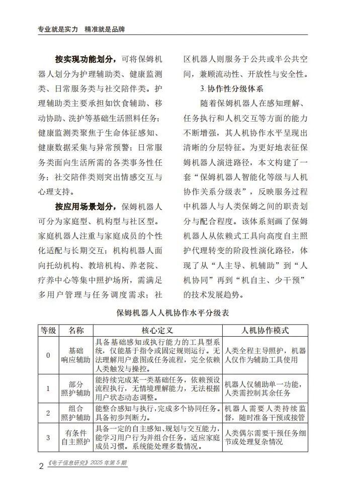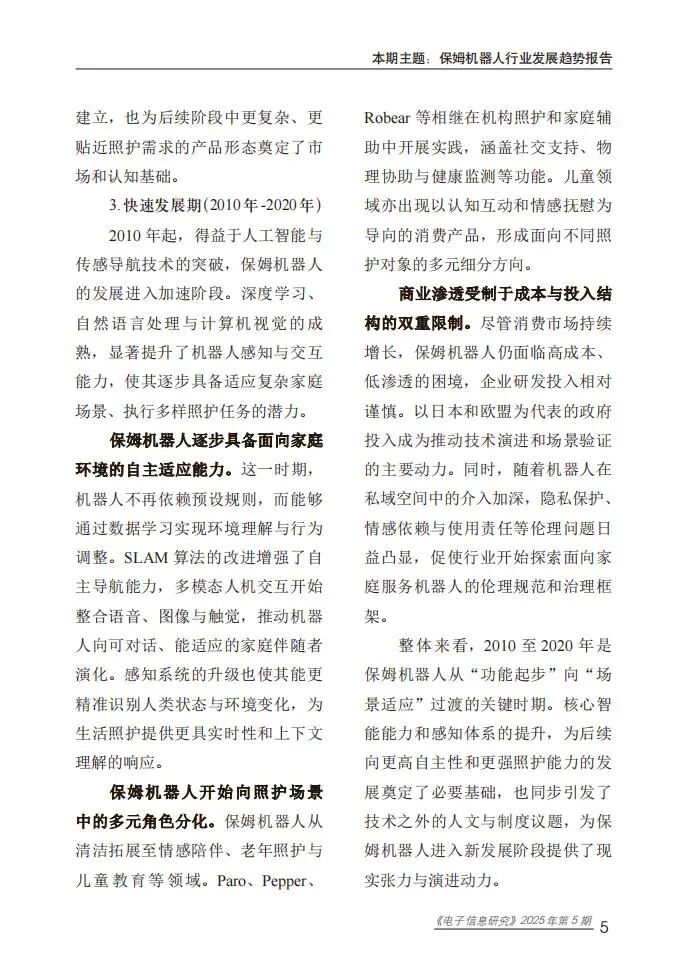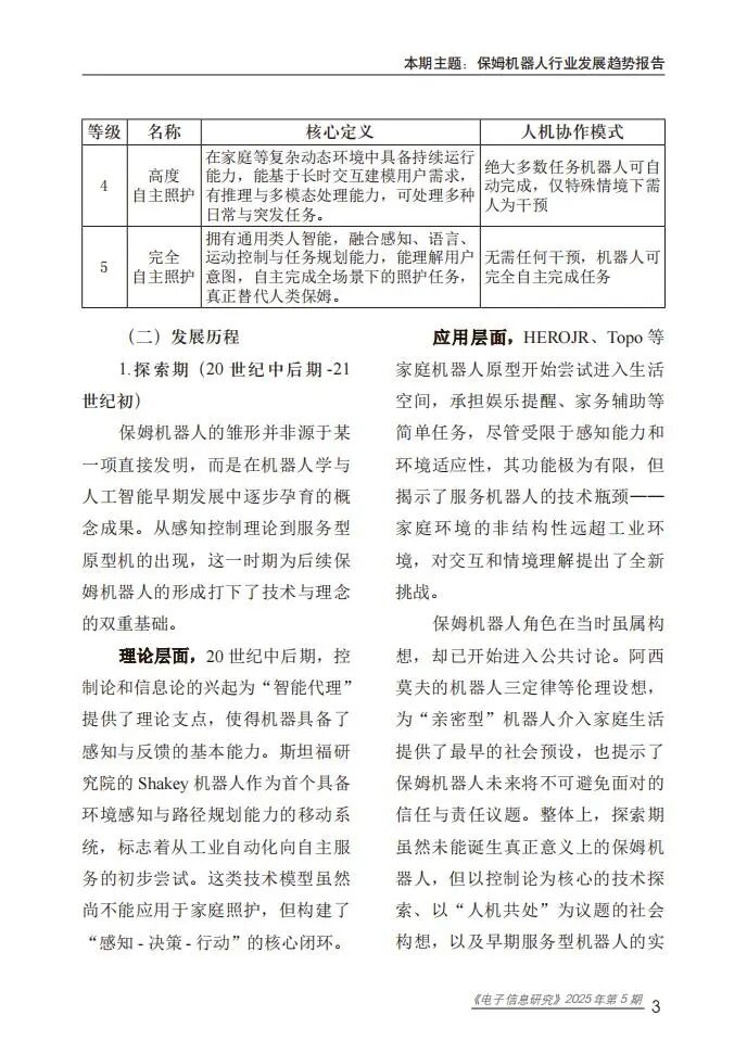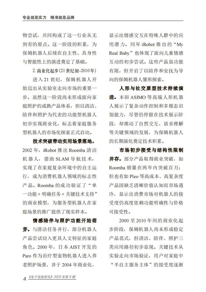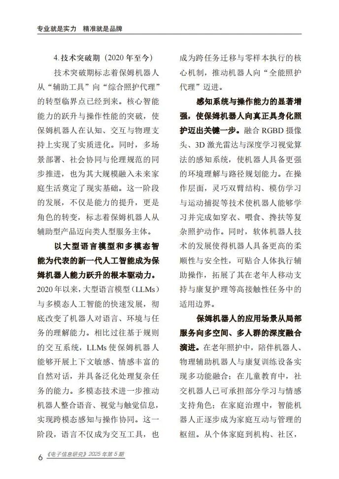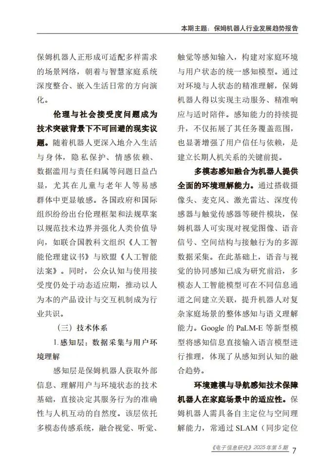 保姆机器人是具备自主性与具身性的智能系统,可替代人类执行护理辅助、健康监测、日常服务及社交陪伴等任务,按服务对象可分为婴童照护、老年照护和成人照护类,按应用场景可分为家庭型、机构型与社区型。其发展历程历经探索期、商业化起步期、快速发展期,目前进入技术突破期,大型语言模型与多模态智能成为核心驱动力,推动其从“辅助工具”向“综合照护代理”转型。技术体系涵盖感知层、决策层、行动层和反馈层,构建了“感知-决策-行动-反馈”的完整闭环,支撑多样化服务功能实现。