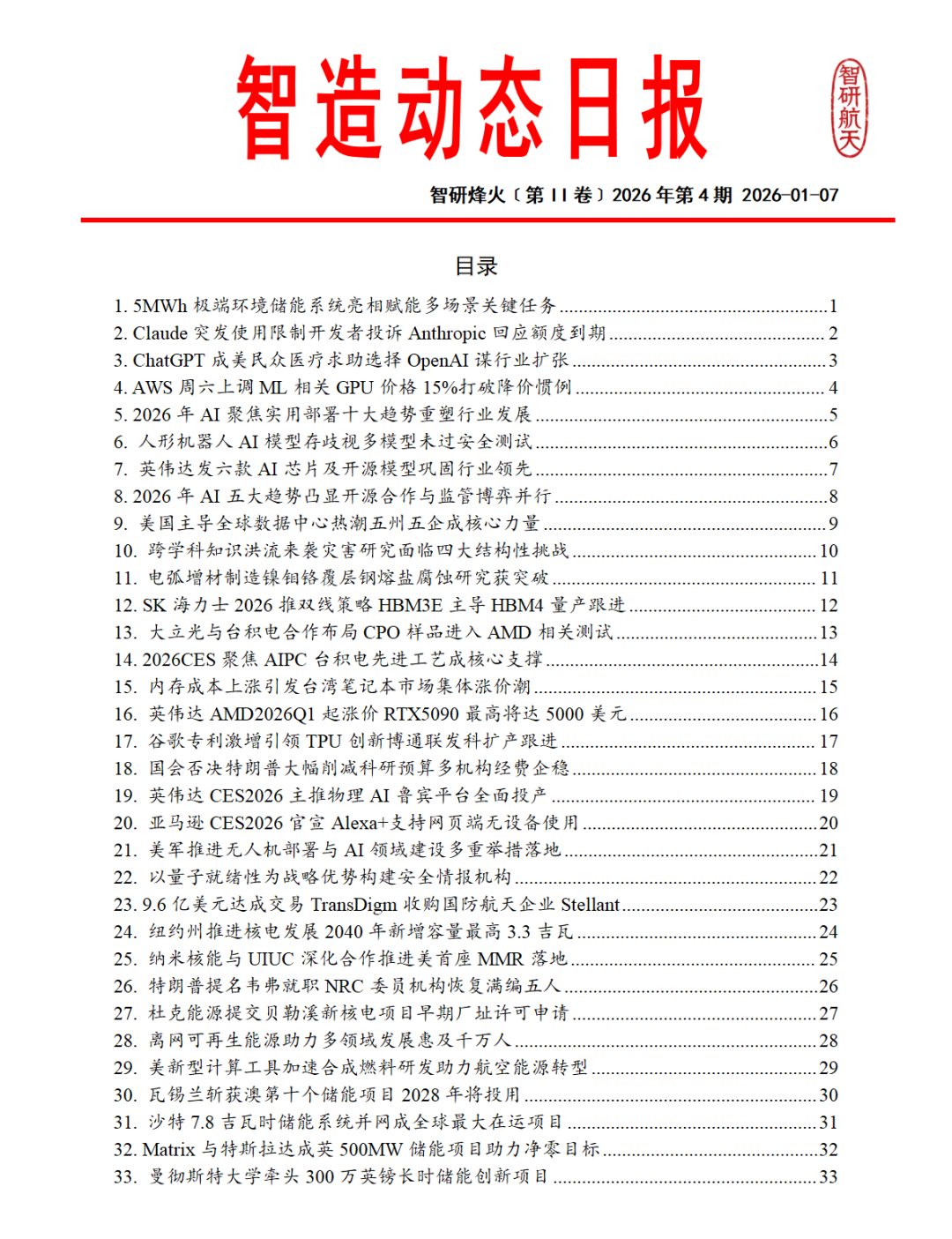 聚焦全球智能制造领域的权威情报产品,每日精选航空技术与应用、人工智能、工业机器人、增材制造、芯片工艺等核心技术突破与产业动态,以结构化、可编辑的文档形式呈现。内容涵盖技术解析、企业战略及政策影响,依托资深专家团队及强大的开源情报处理能力,助力企业快速捕捉技术趋势与市场机遇,把握智造脉搏,引领产业升级。