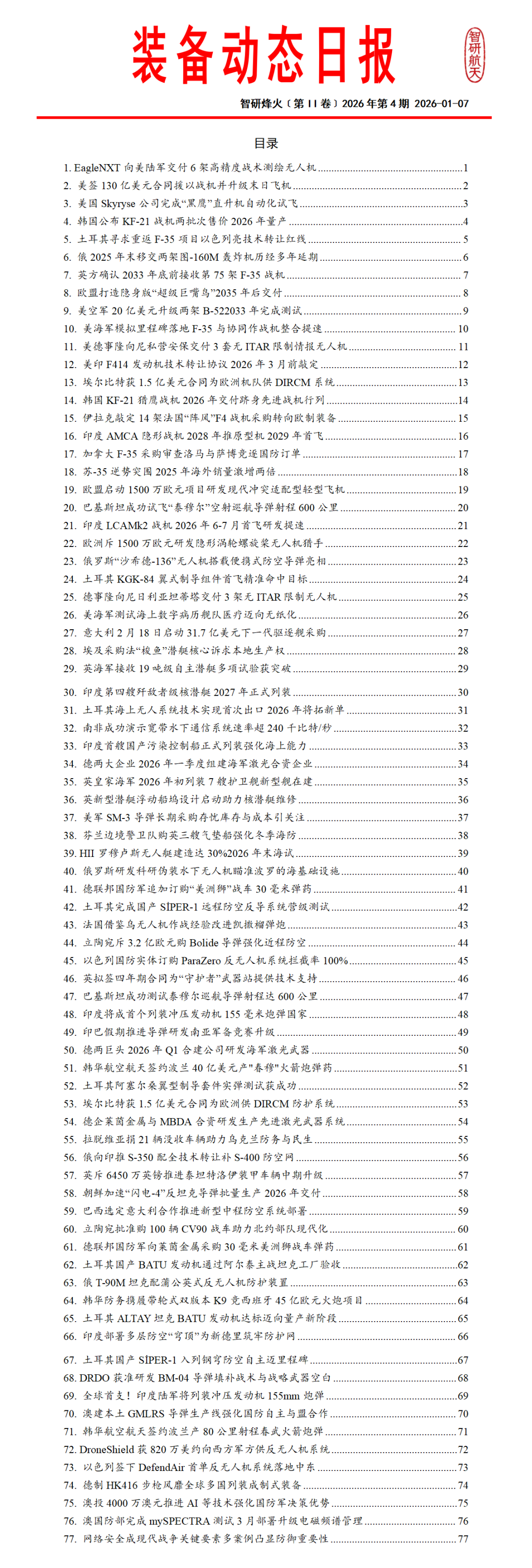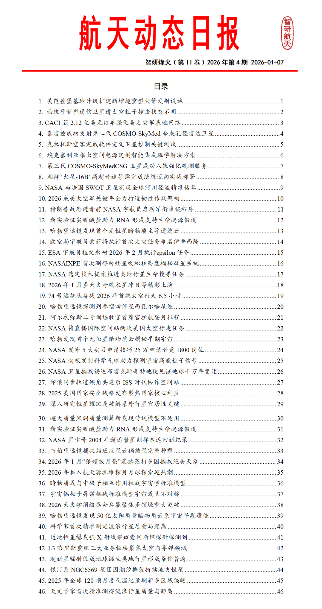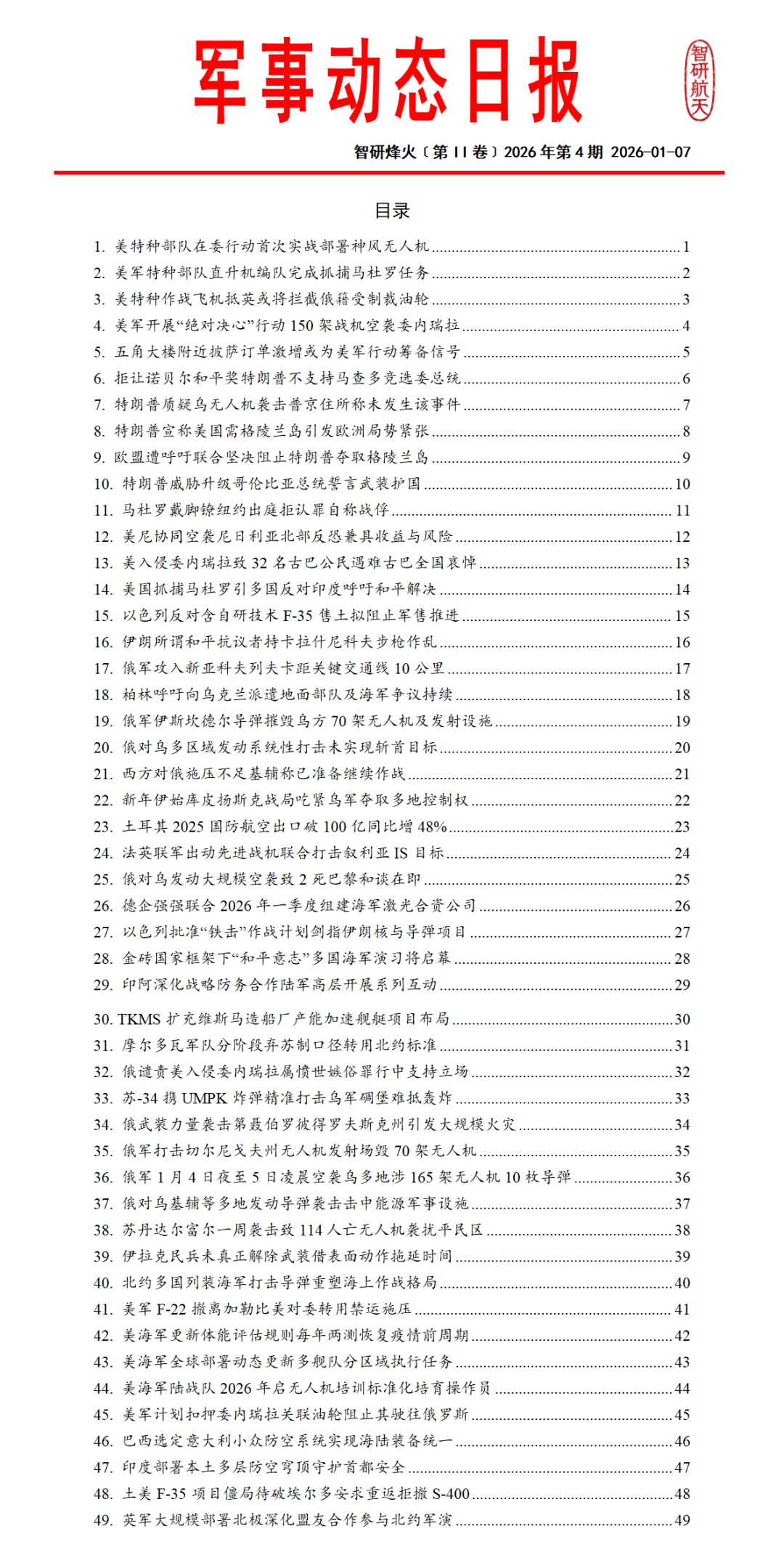 《全球防务动态》系列专刊国内独家每日发布涵盖航天领域、武器装备、军事热点、人工智能、先进制造等领域的全球动态信息。提供“航天动态专报”、“装备动态专报”、“军事动态专报”、“智造动态专报”以及“航天防务新闻日报”等特色产品模块。工作日每日推送,形成结构化、可编辑的文档,供订阅用户在小程序“智研烽火信息”商城下载。每日及时的动态信息能够有力支持各单位进行要讯报送、军情研究与安全形势分析的需求。