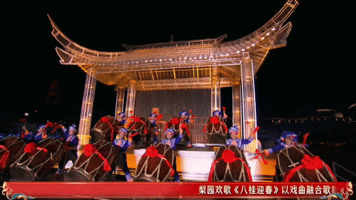《雏凤新声》中,54个机器人与水中机器鱼、飞屏技术共同构筑未来戏曲场域,百余名戏曲萌娃自在挥洒,科技化作托举传承的温暖手掌。《骅骝驰骋》借虚拟AR技术让名将与神骏的传奇腾空而至,赤兔、白龙、麒麟、乌骓四匹骏马承载马年吉祥寓意,于虚实间展现奔腾气象。