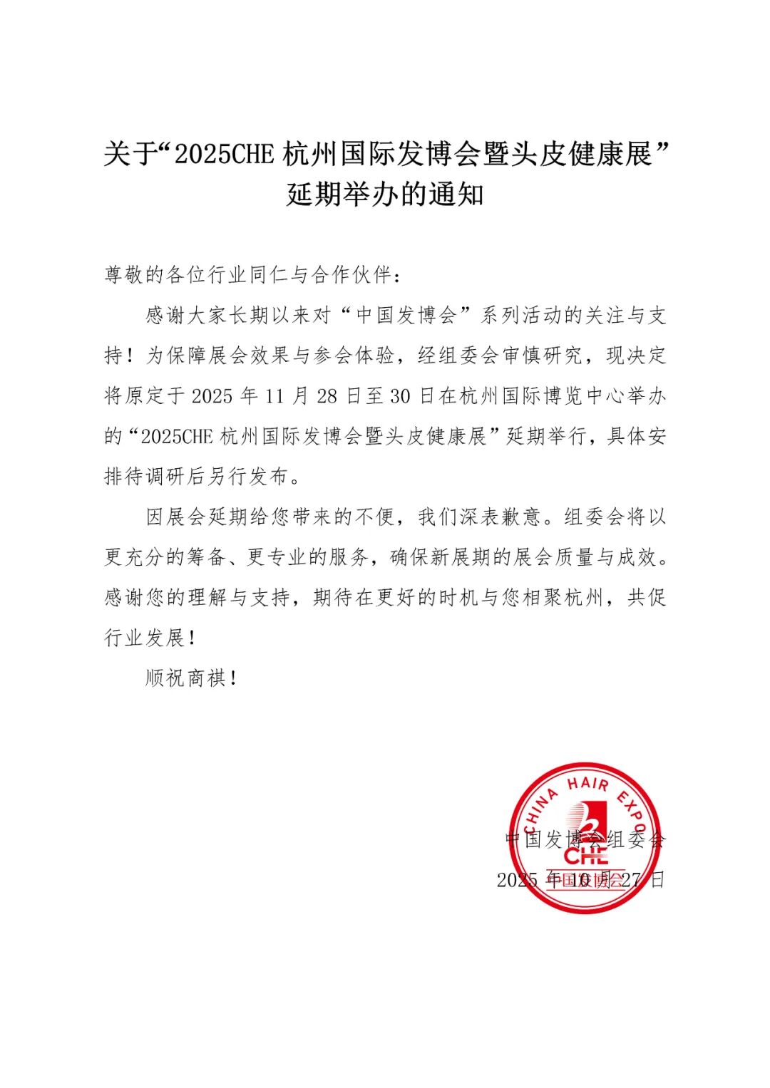 感谢大家长期以来对“中国发博会”系列活动的关注与支持!为保障展会效果与参会体验,经组委会审慎研究,现决定将原定于2025年11月28日至30日在杭州国际博览中心举办的“2025CHE杭州国际发博会暨头皮健康展”延期举行,具体安排待调研后另行发布。