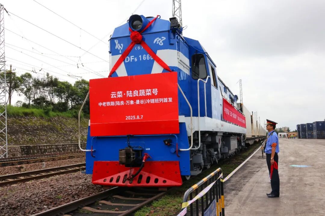 2025年8月7日,“云菜·陆良蔬菜号”中老铁路冷链班列首发。图源:陆良县融媒体中心