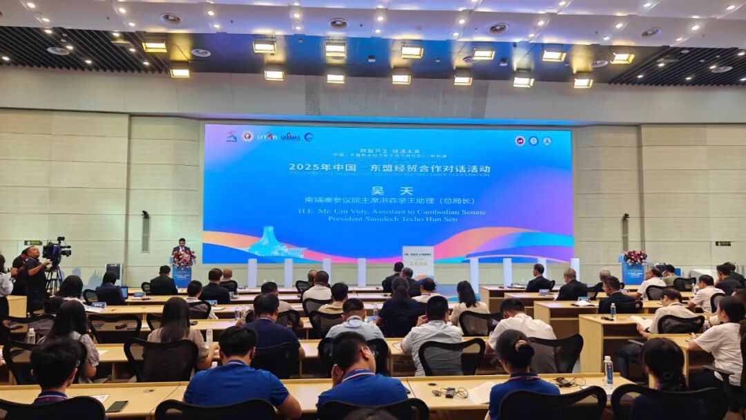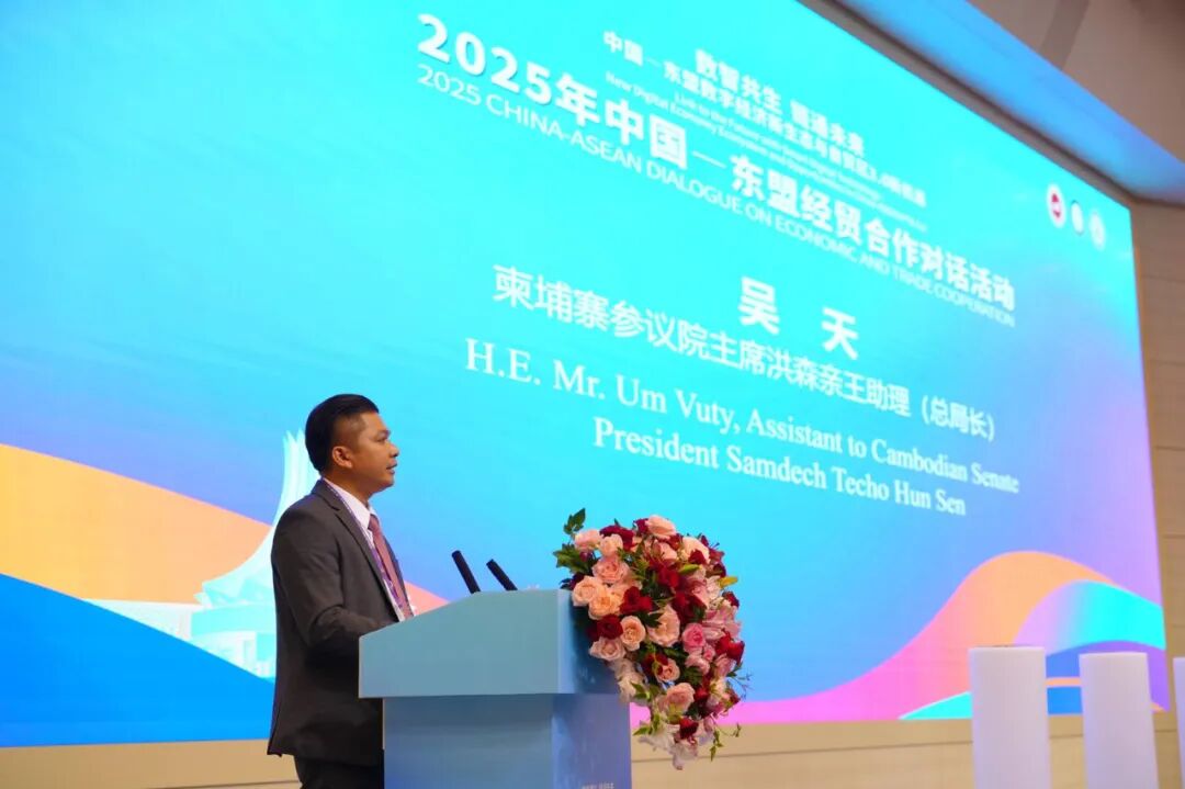 2025年9月17日下午,吴天阁下应邀出席第22届中国—东盟博览会“2025年中国—东盟经贸合作对话活动”开幕式暨蓝皮书发布会并发言致谢中国政府和中国人民对柬埔寨发展的支持。本次对话活动在南宁国际会展中心新闻中心举行,会议发布《中国—东盟经贸合作展望报告(2025—2026)》(即中国—东盟博览会蓝皮书)。本次蓝皮书发布仪式由WTO原副总干事、商务部原副部长易小准,自治区政协副主席钱学明,中日友好协会常务副会长程永华,广西大学党委书记李国忠,柬埔寨参议院主席洪森亲王助理吴天,广西国际博览事务局党组书记、局长韦朝晖,广西大学中国—东盟经济学院院长李光辉等嘉宾共同启动发布。在全场倒计时声中,这份聚焦中国—东盟经贸合作未来的蓝皮书正式面向社会各界亮相。