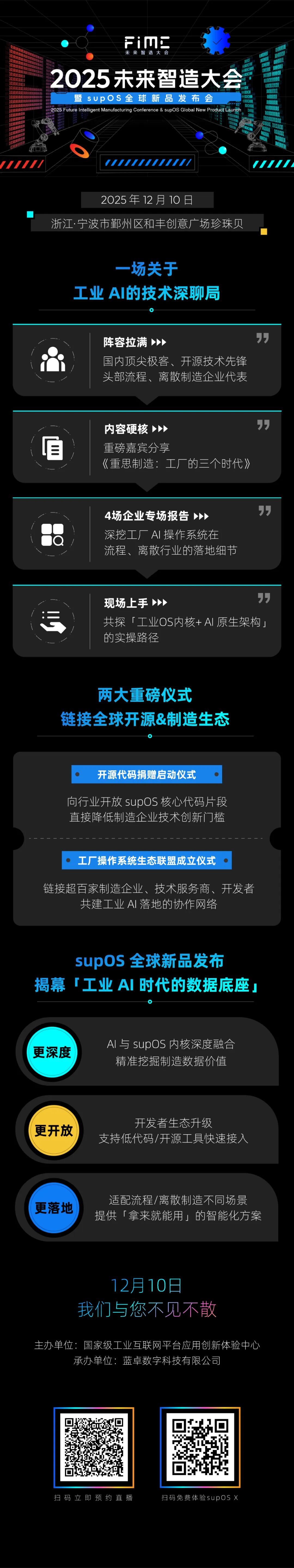 12月10日,2025未来智造大会暨supOS全球新品发布会将在浙江宁波隆重举行。本次大会由国家工业互联网平台应用创新体验中心主办、蓝卓数字科技有限公司承办,聚焦“工业AI时代的数据底座”,旨在推动前沿AI技术与制造业深度融合,为培育新质生产力、促进制造业高质量发展提供坚实支撑。