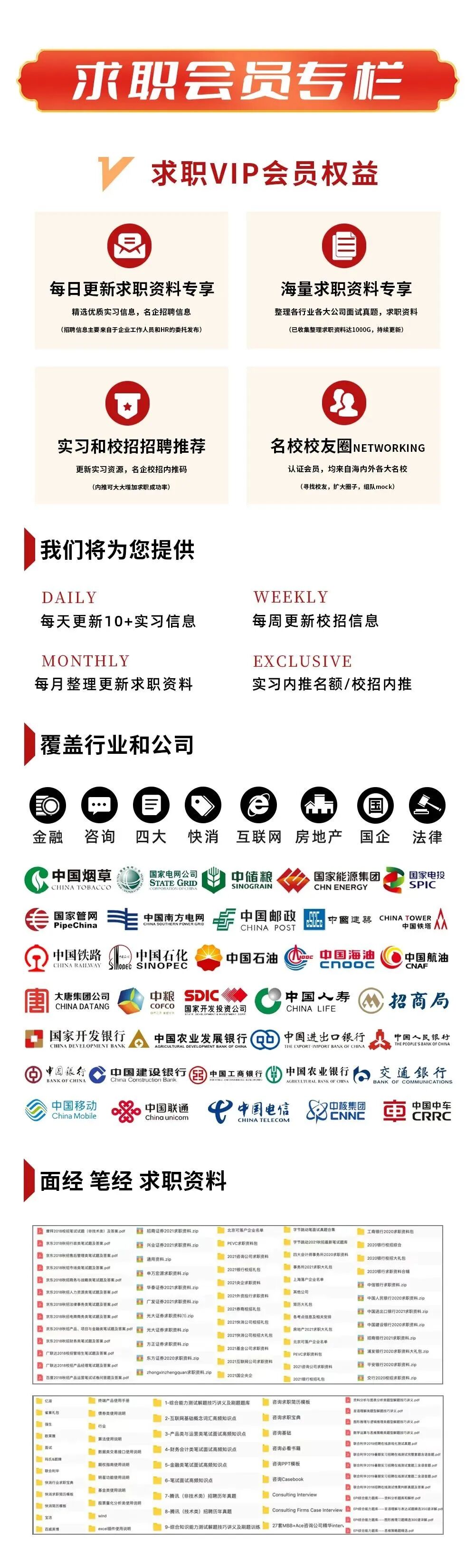 2:我们会定期整理汇总表,分时间:春招/秋招网申汇总表、寒暑假实习信息汇总表、远程实习信息汇总表等...分行业:国企央企汇总表/金融/咨询/互联网/事务所/快消岗位汇总表/国家部委招聘信息等等,每周第一时间分享到VIP会员群!部分展示如下👇