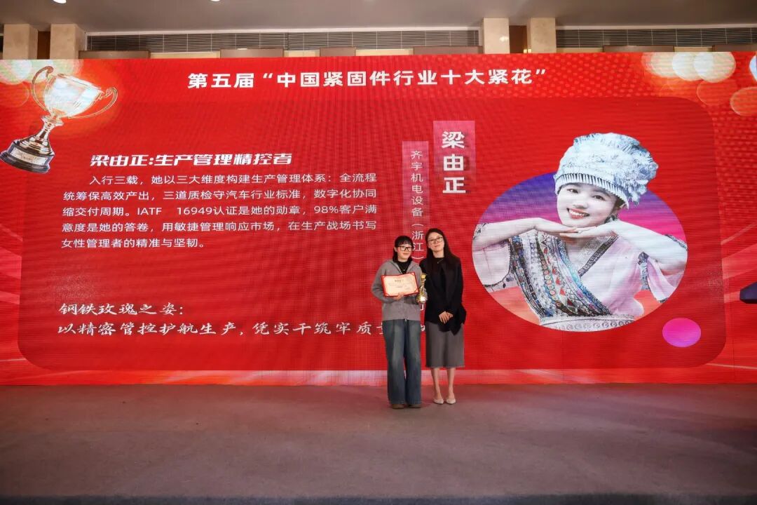 我会理事单位浙江渤威能源科技有限公司销售经理殷燕以及会员单位齐宇机电设备(浙江)有限公司生产主管梁由正凭借在行业内的出色表现,获得第五届“中紧杯”中国紧固件行业十大紧花称号。