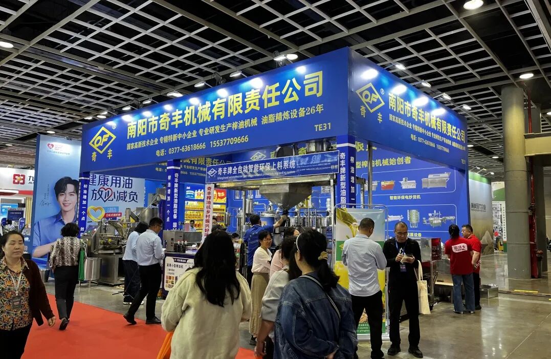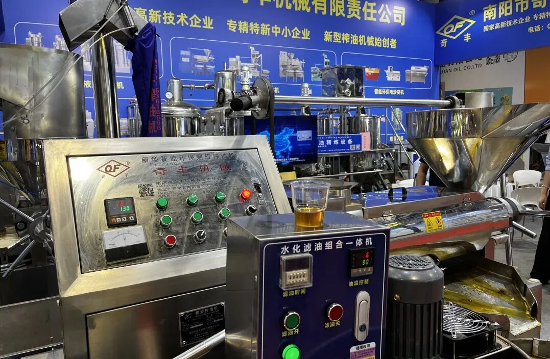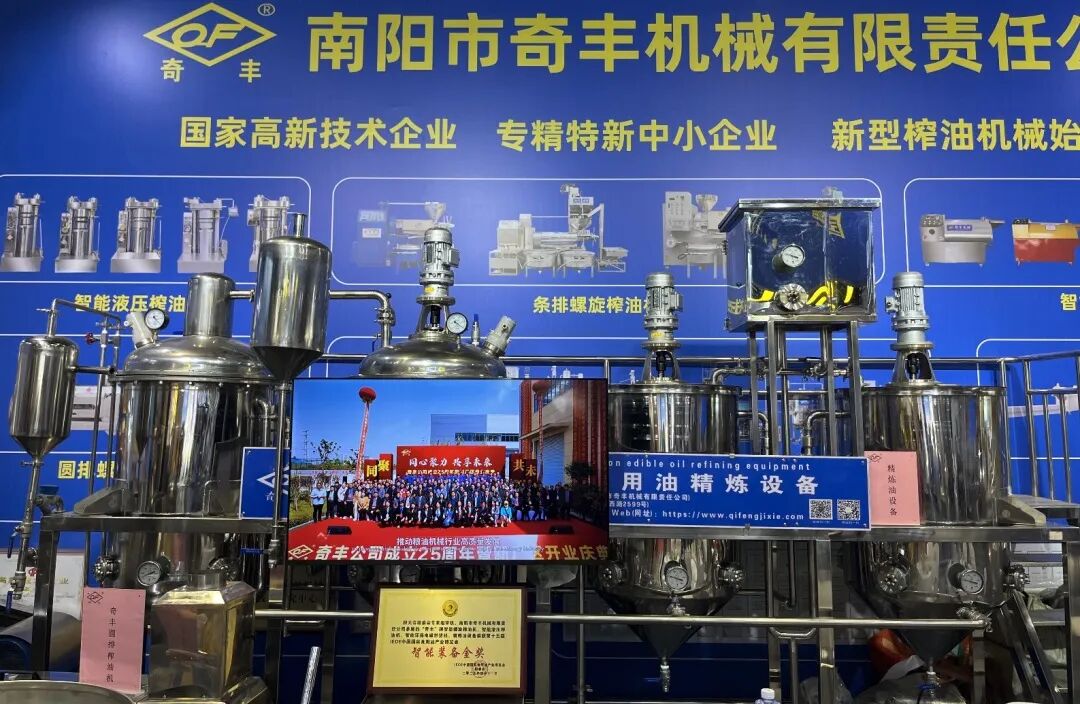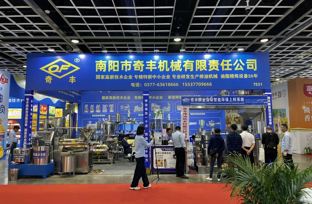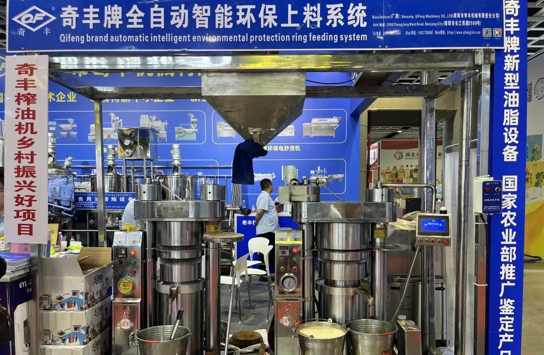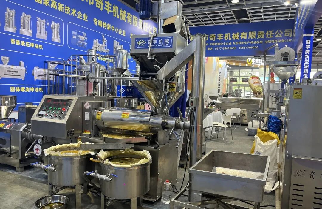 奇丰公司展区,智能液压榨油机、条排螺旋榨油机、食用油精炼设备等多个品类,满足多元化市场需求。