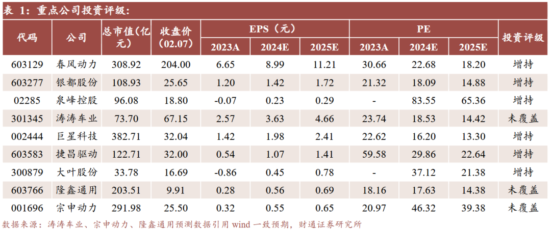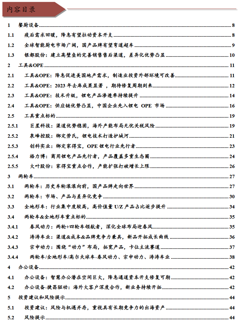 投资建议:建议重点关注:①餐厨设备龙头:银都股份;②工具/OPE龙头:巨星科技、泉峰控股、大叶股份、格力博、创科实业;③两轮车/全地形车龙头:春风动力、涛涛车业、宗申动力;④办公家具龙头:捷昌驱动等。