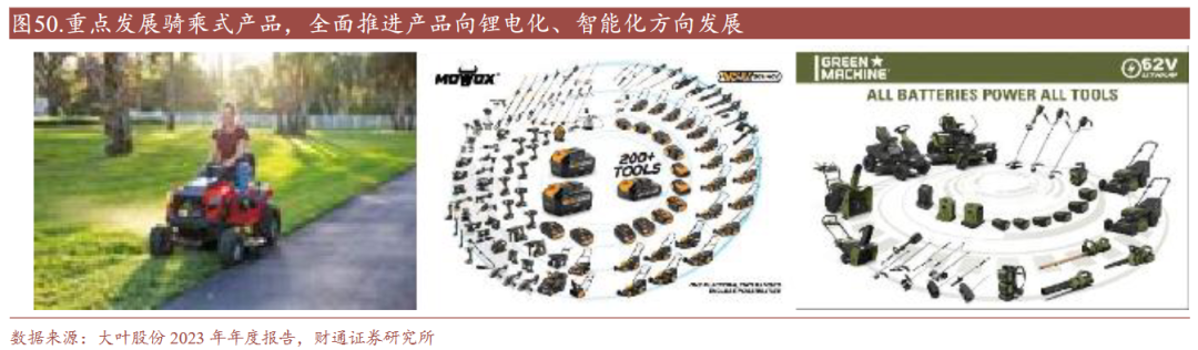 - 持续进行研发投入,全面拓展锂电化、智能化产品。大叶股份研发投入持续增长,规划重点发展骑乘式割草机全系列产品,全面发展大容量、高压62V锂电平台产品线和低压20/40V锂电平台产品线,开发更具节能、环保、智能的园林设备等一系列创新产品。