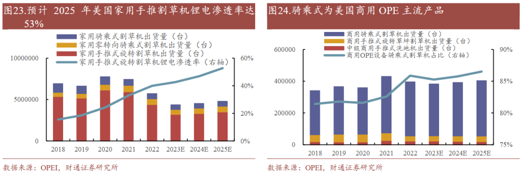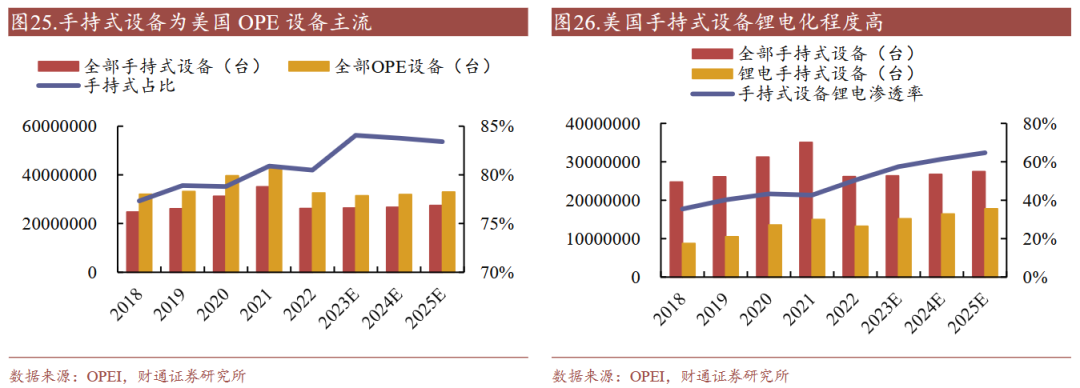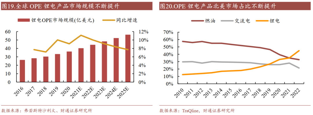 锂电OPE市场前景广阔,北美市场锂电份额已超燃油设备。2016年开始,锂电OPE市场规模稳定上升,同时锂电渗透率稳步增加。根据弗若斯特沙利文的预测,到2025年,锂电OPE市场规模有望达56亿美元,2020-2025年CAGR达9.24%。根据TraQline的数据,北美市场方面燃油产品的市场占比不断下降,到2022年跌至32.8%;而锂电产品市场占比在2022年达到44.9%,完成对燃油产品的超越,同比增长9.9pct,锂电OPE进入黄金发展时期。