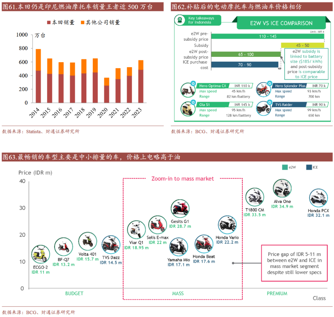 以印尼为例:车主要用途在于生活(通勤等),燃油摩托车,本田仍是王者,国产摩托难以突围:根据Statista,2022年印尼摩托车保有量达到1.32亿台,连续九年保持世界第三,仅次于印度和中国。印尼的人均摩托车保有量达到0.48台,家庭摩托车拥有率达到85%。2023年摩托车总销量达到623万台,其中本田摩托车占488万台。本田优势:1)先发优势,培养消费习惯,销售网点多且售后服务完善;2)物美价廉,造型时尚且燃油经济性好。