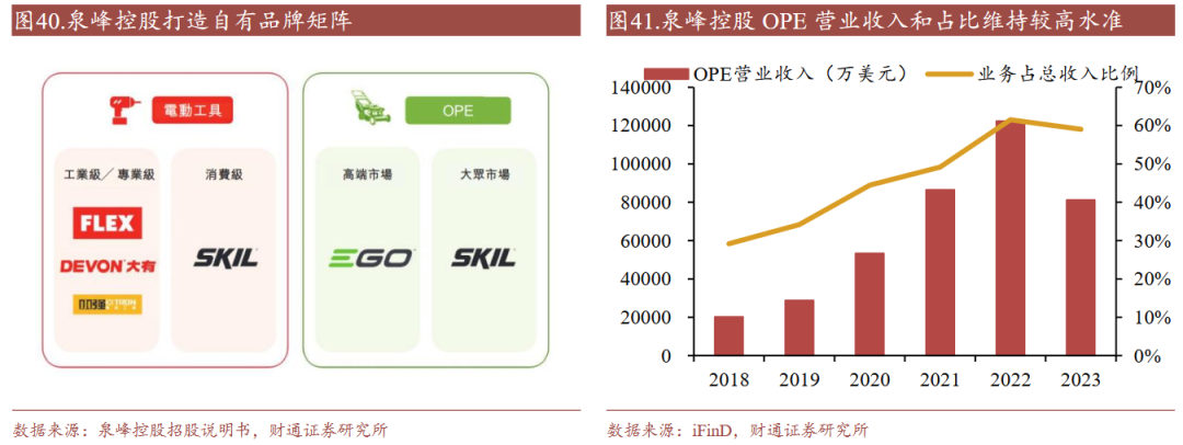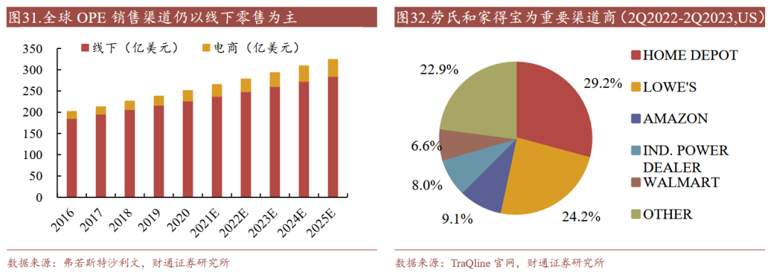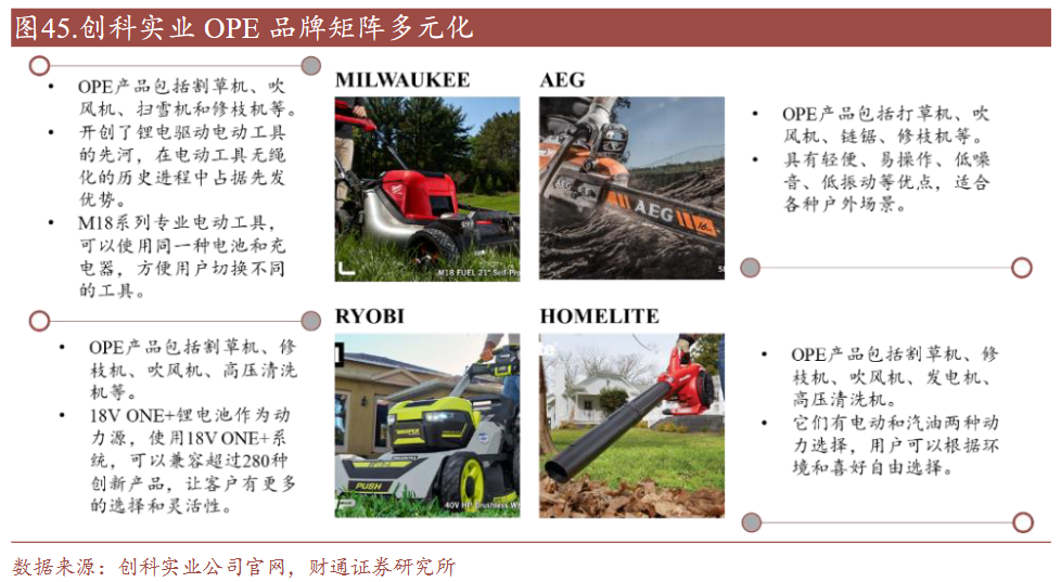 ①产品端:创科实业OPE品牌矩阵多元化,有力扩张商业版图。创科实业电动工具业务共有9个品牌,涉及OPE业务的有4个品牌,涵盖多场景的割草机、吹风机、打草机、链锯、修枝机等一站式园林解决方案。不同品牌定位互补,形成的品牌矩阵让客户有更多的选择性和灵活性,在高度竞争的市场氛围下保持客户粘度。