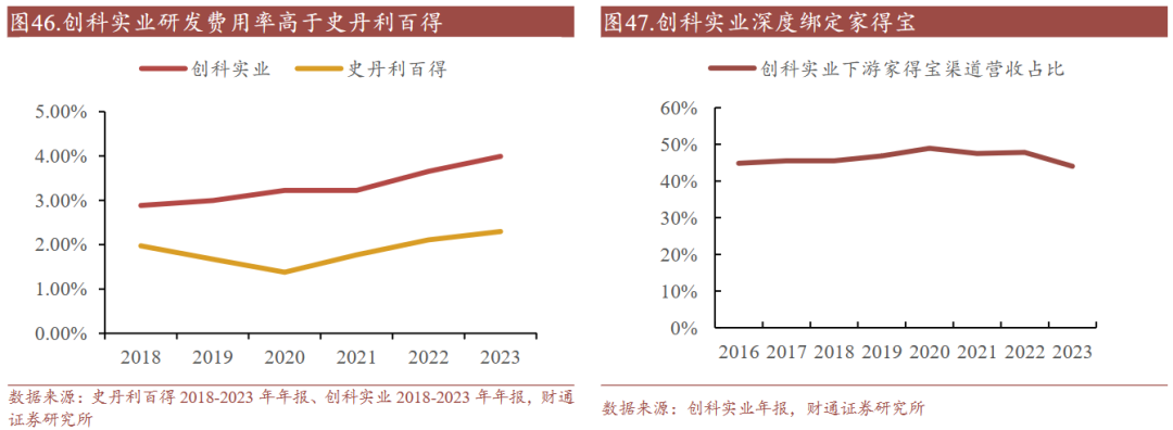 ②技术端:高研发投入带来足够的技术壁垒。创科实业主要聚焦锂电式电动工具,开发了一系列走在行业前端的所需的锂电池、高性能无碳刷马达、智能系统等,这些技术附加在新产品上助力营收及利润率的双丰收。创科实业的研发费用率较高,2023年为3.99%,高于史丹利百得的2.29%。