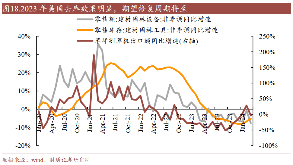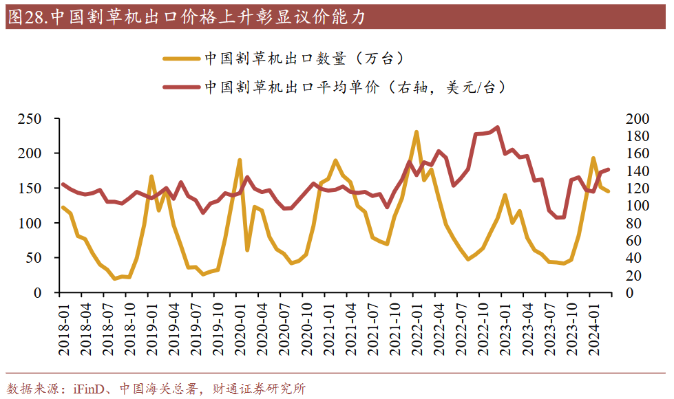 OPE出口价格上升彰显议价能力。以OPE核心产品割草机为例,1Q24中国割草机(包括割刀水平旋转草坪、公园或运动场机动割草机)出口均价为131.59美元/台,环比增加4.17%,说明中国割草机企业有一定议价能力,能将成本压力转移至下游企业。同时,受价格上涨、海运费高昂与原材料上涨等多重影响,2023年中国出口割草机数量为946.15万台,同比下降27.3%。
